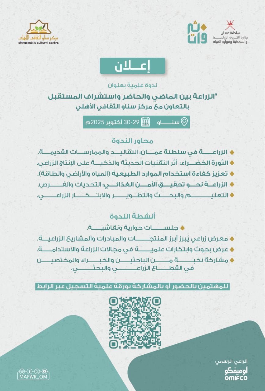 تنظم وزارة الثروة الزراعية والسمكية وموارد المياه بالتعاون مع مركز سناو الثقافي الأهلي ندوة علمية عن الزراعة بين الماضي والحاضر و استشراف أفاق المستقبل وذلك خلال الفترة من 29 أكتوبر إلى 30 أكتوبر المقبل بالقاعة الكبرى بمركز سناو الثقافي الأهلي .