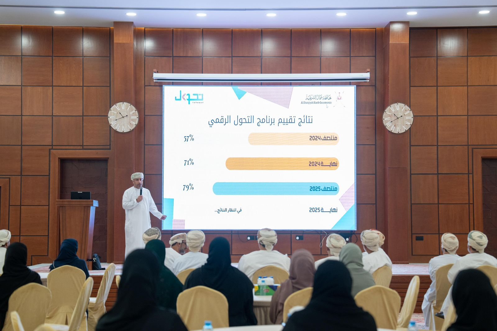 كما استعرض الدكتور بدر الحاتمي، رئيس فريق التحول الرقمي، مؤشرات التحول الرقمي في المحافظة، متناولًا مستوى جاهزية الأنظمة الإلكترونية ومدى تكامل الخدمات بين الجهات الحكومية، إلى جانب المبادرات التقنية الجاري تنفيذها لتسريع التحول الرقمي ورفع الكفاءة التشغيلية.