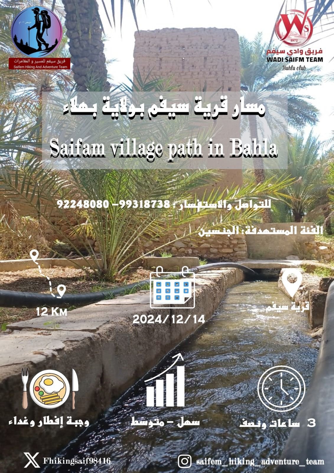 يقام المسير تحت رعاية سعادة الشيخ عمر بن علي الجنيبي عضو مجلس الشورى ممثل ولاية بهلاء وأكد خلفان بن سالم بن سرحان الشكيلي عضو اللجنة المنظمة لهذه الفعالية الرياضية الوطنية أن المسير سيشهد مشاركة مايزيد على ١٥٠٠ مشارك من فرق المسير والمغامرات وفرق الترحال والهايكنج والفرق الرياضية والاهلية والأفراد على مستوى سلطنة عمان وهو يجسد الولاء والعرفان لقائد مسيرة النهضة المتجددة ويحمل شعار الولاء والعرفان ٥٤ ومسافة المسار ١٢ كيلو مترا ونقطة إنطلاق المسير ستكون من أمام مقر فريق وادي سيفم في السابعة صباحا ويمر المشاركون على هضاب وواحات وضواحي بلدة سيفم الخضراء مرورا بحارة السيباط الأثرية وستكون هناك نقاط للإستراحة والتقاط الصور ومشاهدة المعالم السياحية والأثرية وكذلك للتزود بالمياه والتغذية حيث ستقوم اللجنة المنظمة بمتابعة المشاركين وتقديم الدعم اللازم لهم.