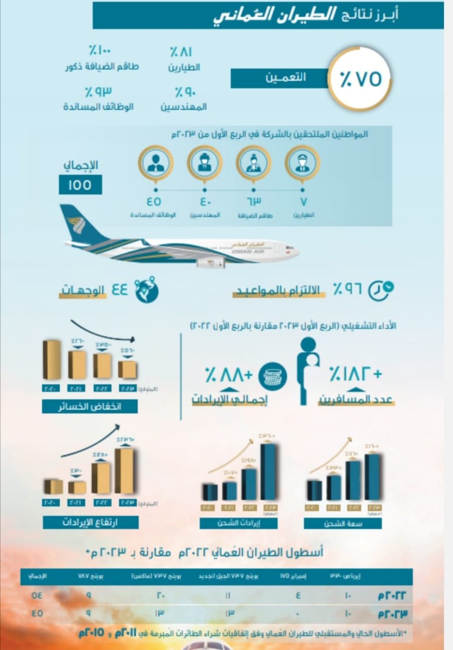 تأتي مشاركة الطيران العماني في معرض سوق السفر العربي دبي ٢٠٢٣م ضمن أولويات الشركة من خلال استهداف سوق السفر العربي دبي ٢٠٢٣م والذي اختتم مؤخراً بمدينة دبي إذ أعلن الطيران العماني مؤخراً عن أبرز النتائج التي تحققت خلال الربع الأول من العام ٢٠٢٣م إذ تمكنت الشركة من تحقيق نسبة تعمين بإجمالي عام من موظفي الشركة بنسبة ٧٥٪، حيث تصدر نسبة التعمين الذكور من العمانيين بنسبة ١٠٠٪ يليه نسبة التعمين في الوظائف المساندة للعمانيين بنسبة ٩٣٪ ومن المهندسين العمانيين بنسبة ٩٠٪ من إجمالي المهندسين العاملين في الشركة وأخيراً وصل عدد الطيارين العمانيين إلى نسبة ٨١٪ ، حيث شكل طاقم الضيافة العدد الأكبر من المواطنين الملتحقين بالشركة في الربع الأول إذ وصل عدد طاقم الضيافة إلى ٦٣ يليه ٤٥ من الوظائف المساندة ثم ٤٠ من المهندسين وأخيراً ٧ من الطيارين بواقع ١٠٠ موظف انظموا للعمل في أسطول الطيران العماني الذي يولي اهتماما كبيرا في عملية توظيف الكوادر الوطنية.