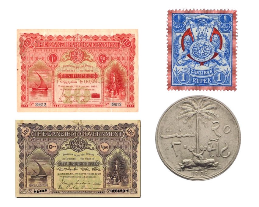 ١)الروبية الزنجبارية الورقية والمعدنية والطوابع في عهد السيد علي بن حمود عام ١٩٠٨م.