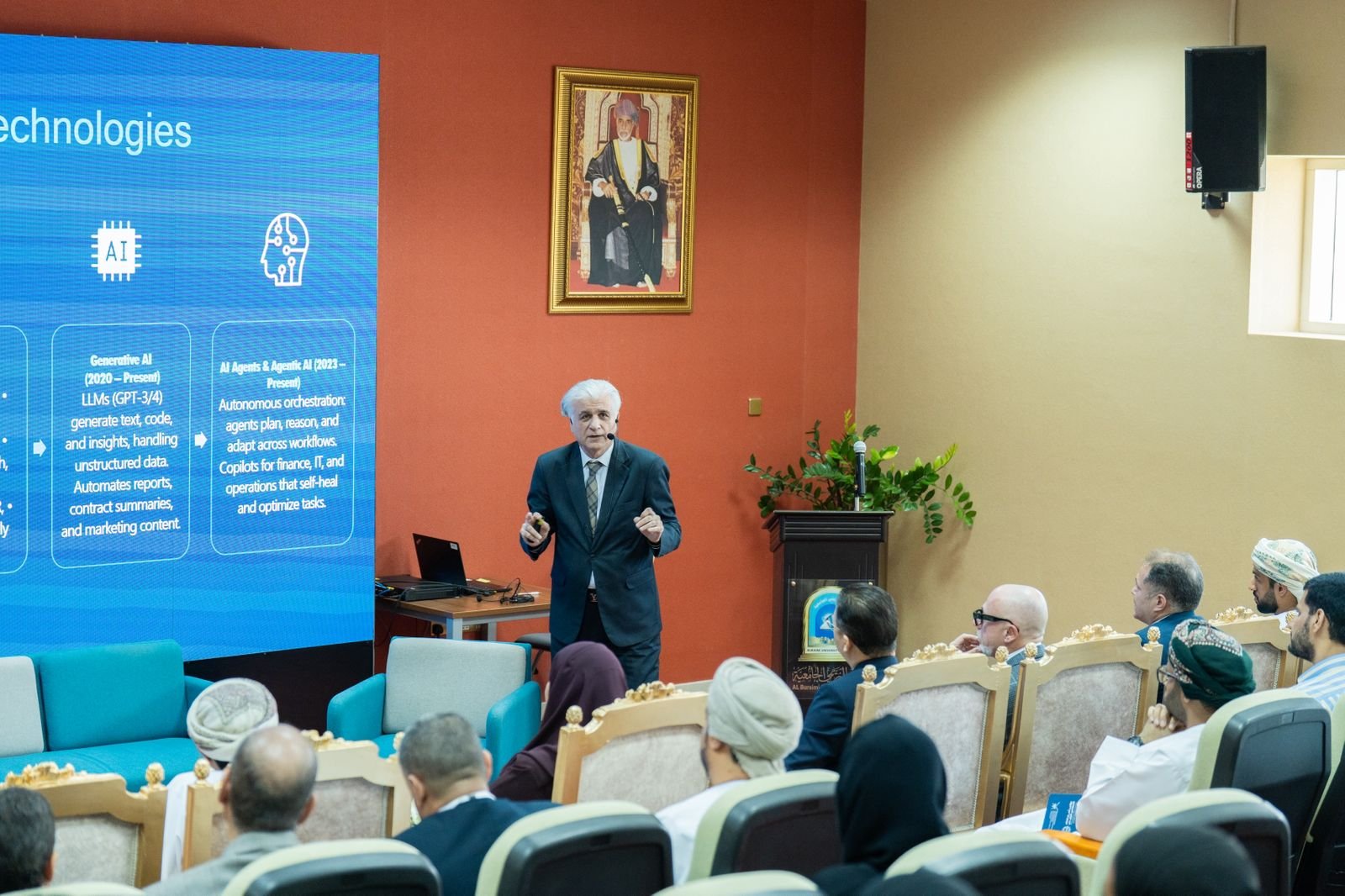إلى جانب ذلك، قدم الدكتور ضحي الشكيلي، مساعد عميد كلية علوم الحاسوب والمعلومات بجامعة التقنية والعلوم التطبيقية بسلطنة عمان، محاضرة بعنوان: “من مستهلكين سلبيين إلى متعلمين نشطين: كيف نوجه دور الذكاء الاصطناعي في التعليم”، موضحً كيف يمكن للذكاء الاصطناعي أن يسهم في تطوير أساليب التعلم والتفاعل، ويُحدث تحولًا في كيفية استخدام الطلبة للمحتوى الأكاديمي. كما قدم الأستاذ لؤي أبو شاور، عضو المجلس العالمي للذكاء الاصطناعي بكندا، محاضرة حول كيفية الحفاظ على الثقة والحقائق في الأوساط الأكاديمية في ظل التقدم التكنولوجي السريع، وركز الدكتور ماجد العدوان، أستاذ مشارك في جامعة صحار بسلطنة عمان، والدكتورة خديجة البلوشية – خبيرة اعتماد مؤسسي في الهيئة العمانية للاعتماد الأكاديمي وضمان جودة التعليم على أهمية النزاهة في التعليم والبحث العلمي.