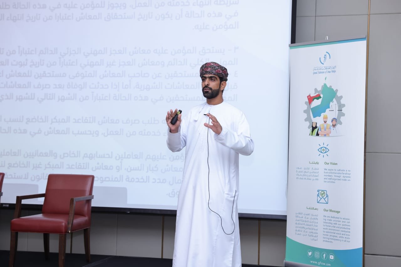 كما استعرض يوسف بن خصيب البوسعيدي مدير دائرة الخدمات النقابية والعمالية بالاتحاد العام لعمال سلطنة عمان أبرز ما جاء في قانون العمل من ناحية الأحكام العامة وأحكام تشغيل العمانيين وأحكام عقد العمل وأحكام ساعات العمل والإجازات في قانون العمل وأحكام السلامة والصحة المهنية وتسوية منازعات العمل الفردية والجماعية وأحكام الإضراب السلمي والعقوبات في قانون العمل.