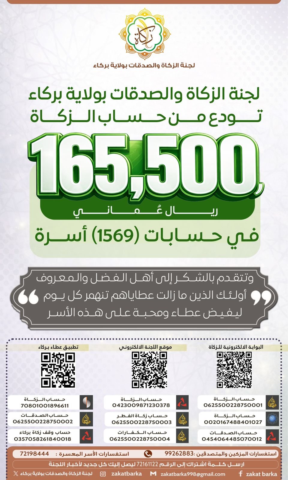 أودعت لجنة الزكاة والصدقات بولاية بركاء مبلغًا قدره 165 ألفًا و500 ريال عُماني في حسابات 1569 أسرة مستحقة، وذلك ضمن جهودها المتواصلة لدعم الأسر ذات الدخل المحدود خلال شهر رمضان المبارك.