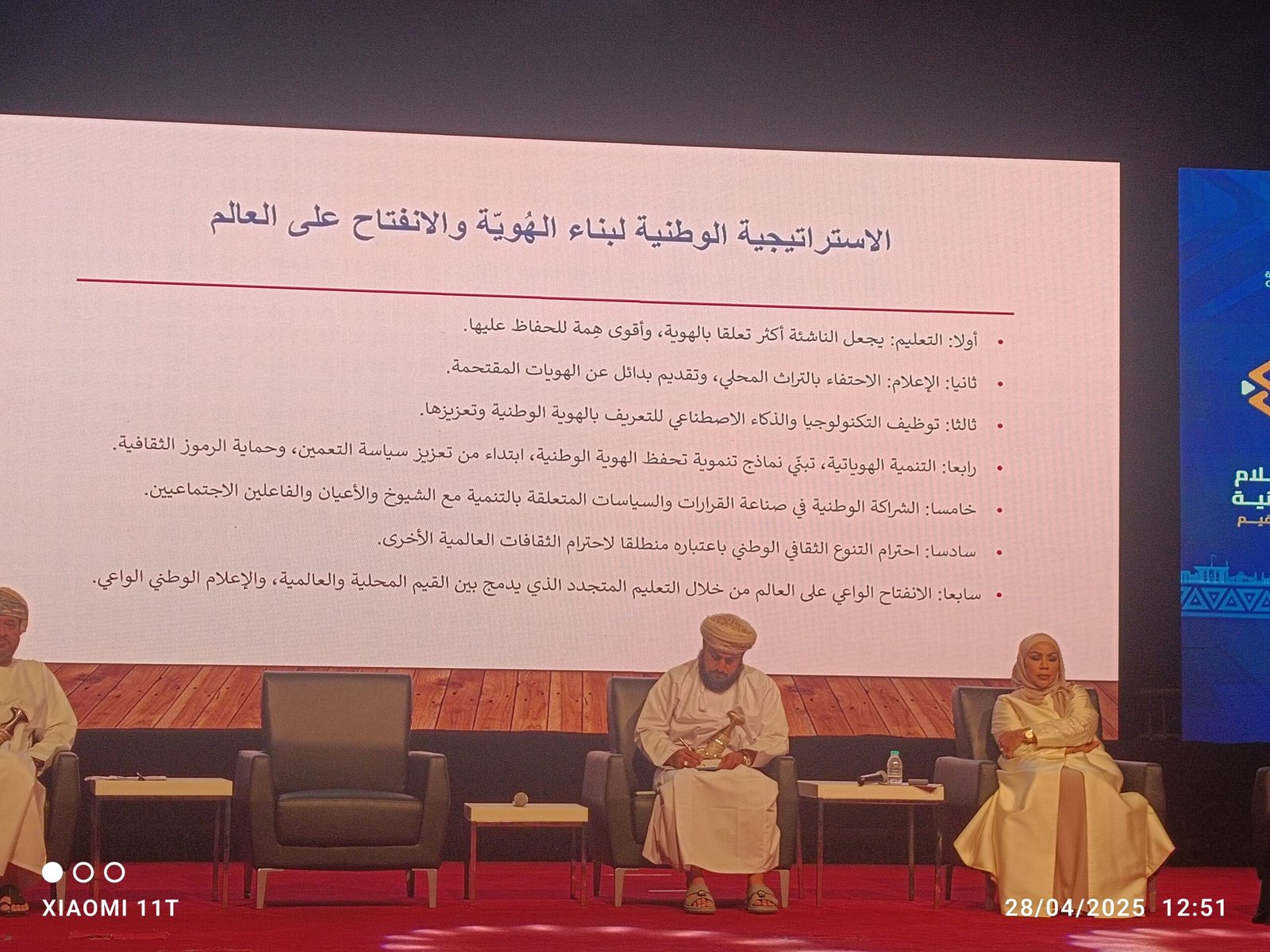 أما الدكتورِ زكريا المحرمي فقد ركز في ورقته تعليمُ الهويةِ العُمانيَّةِ للأطفالِ بطريقةٍ إبداعيةٍ عبر المنصاتِ الإلكترونيةِ.وإبرازُ التراثِ العُمانيِّ ورموزهِ الثقافيَّةِ والوطنيةِ.وصياغةُ استراتيجياتٍ توازنُ بين الهويةِ والانفتاحِ على العالمِ.وتعزيزُ مفهومِ الهويةِ المتجددةِ المنفتحةِ مع الحفاظِ على الأصالةِ.ودعمُ الدراساتِ الأكاديميةِ المتعلقةِ بالهويةِ الوطنيَّةِ العُمانيَّةِ.