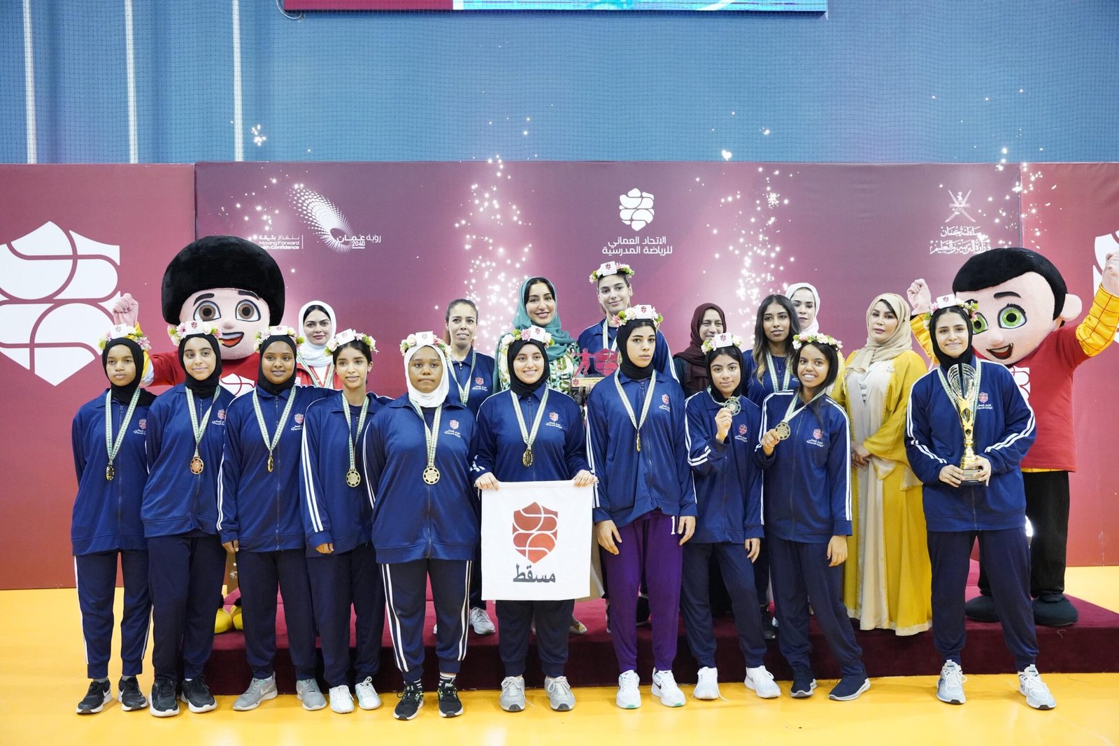 النهائي أقيم في الصالة الرئيسية بمجمع السلطان قابوس الرياضي ببوشر تحت رعاية خولة بنت حمود الحارثية الرئيسة التنفيذية لمؤسسة إنجاز عمان، وبحضور رحمة بنت محمد بن سيف المحروقية المديرة العامة المساعدة للشؤون المالية، وصفاء بنت سيف السالمية عضو مجلس إدارة الاتحاد العماني للرياضة المدرسية، وعدد من ممثلات الشركات الداعمة للاتحاد.
