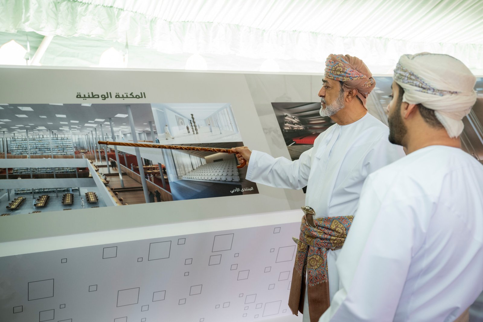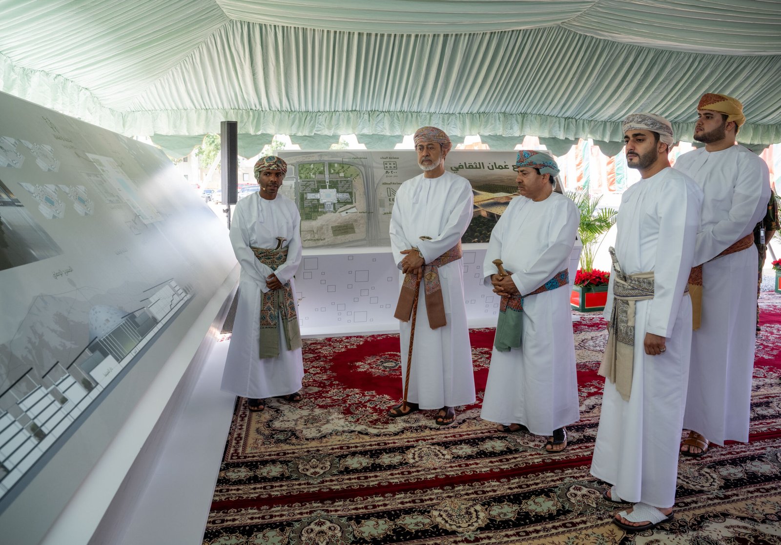 عقب ذلك تفضّل جلالةُ السُّلطان المعظم بالاطلاع على تصاميم مبنى مجمع عُمان الثقافي من خلال لوحات عرض أبرزت محتويات المشروع الذي يعد تجسيدا للرؤية السامية لإنشاء وجهة فنية وثقافية بمستويات عالية وإنجازًا حضاريًّا وثقافيًّا وعلميًّا وفكريًّا، وكيانًا مؤسسيًّا يمثل صرحًا من صروح النهضة المباركة.
