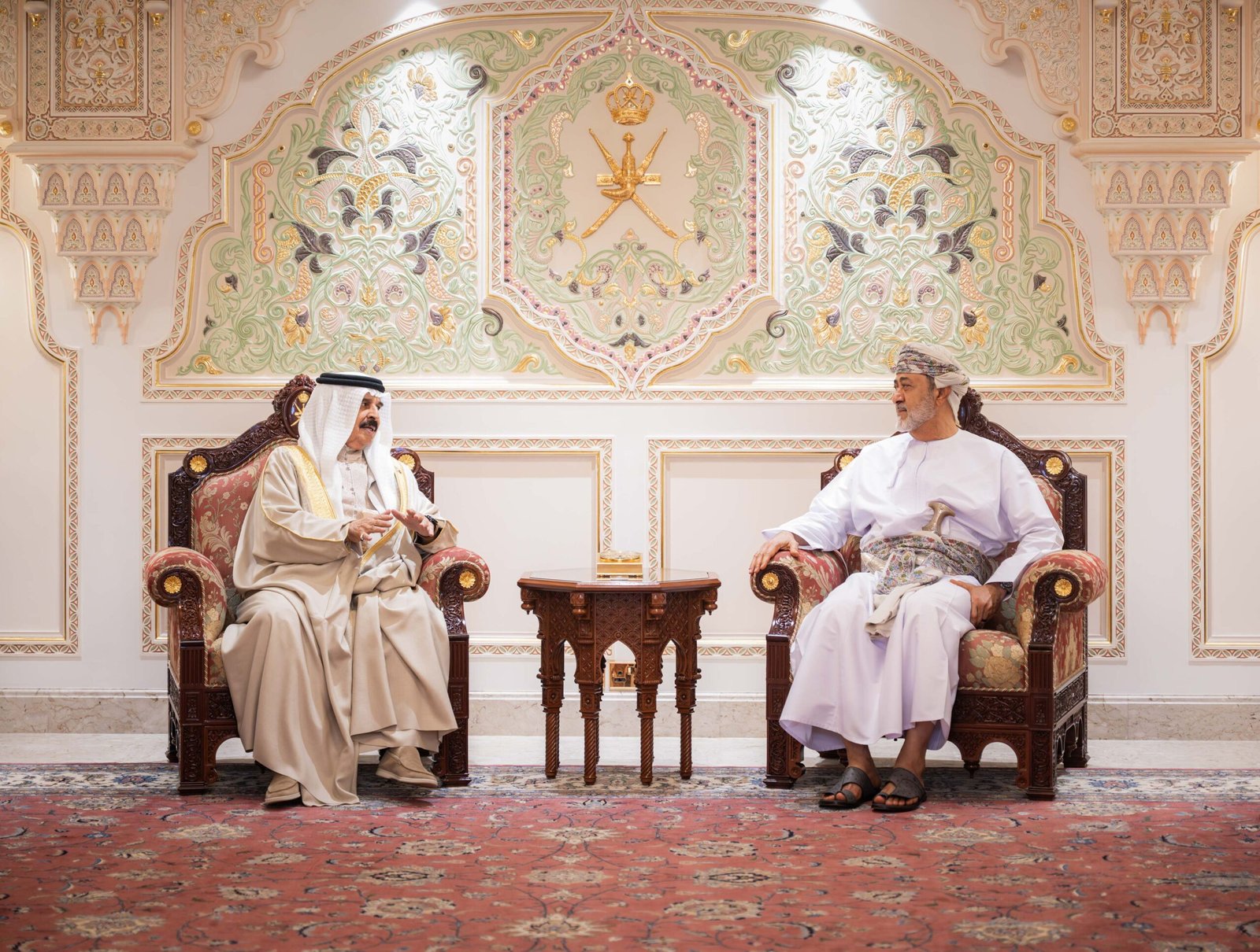 عقد حضرةُ صاحبِ الجلالةِ السُّلطان هيثم بن طارق المعظم وأخوهُ حضرةُ صاحبِ الجلالةِ الملك حمد بن عيسى آل خليفـة ملك مملكة البحرين الشقيقة /حفظهُما اللهُ ورعاهُما/ لقاءً وديًّا مساء اليوم ببيت الرّباط العامر بصلالة.