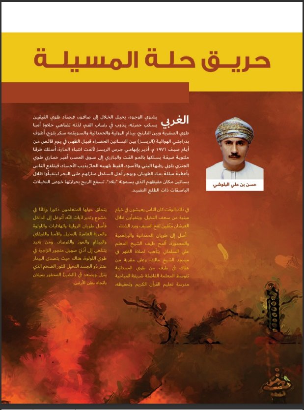 “الغربي يشوي الوجوه ، يحيل الخلال إلى صافور ، فرصاد طوي الفيقين الغربي يسكب حمرته ، يذوب في رضاب الفم ، لذته تضاهي حلاوة أمبا طوي الصفرية وبين النارنج ، بيذام الرولية والحمدانية والسويقمه سكر بلوج ، أطوف بدراجتي الهوائية ( الريسز ) بين البساتين الخضراء قبيل الظهر ، في يوم قائض من أيام صيف ١٩٧٦ م ، أدير بإبهامي جرس الريسز لألفت انتباه المارة ، أسلك طرقا ملتوية ضيقة يسلكها بائعو القت والبازري إلى سوق العصر”
