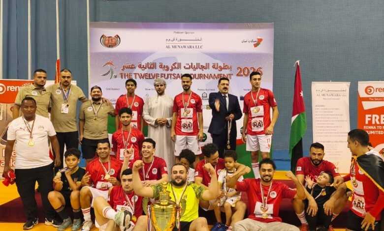تحت رعاية سعادة الشيخ فيصل بن عبدالله الرواس، رئيس مجلس إدارة غرفة تجارة وصناعة عُمان، اختتمت مساء الخميس 12/2/2026 بصالة مجمع السلطان قابوس الرياضي ببوشر بطولة الجاليات الكروية في نسختها الثانية عشر، تحت شعارها الدائم ( نحبك عُمان). والتي ينظمها نادي الجالية الأردنية بسلطنة عمان.