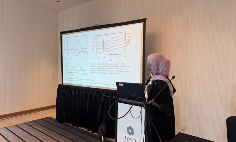 ولهذا النوع من الزجاج تطبيقاته الطبية الحيوية الواسعة، خاصة في مجال تجديد العظام، حيث تعزز نمو العظام وترتبط بشكل جيد مع الأنسجة الحية بفضل إطلاق أيونات مثل Ca²⁺ وSr²⁺ . بينما يناقش بحثها الثاني نتائج دراسة خصائص الزجاج المكون من مواد زجاجية مختلطة، وهو زجاج الجرمانوفوسفات المحتوي على الصوديوم، حيث هدف البحث إلى دراسة خلط عدد اثنين من الأكاسيد الزجاجية مع وجود معدل واحد وهو الصوديوم ومقارنة التغير في البنية التركيبية والخصائص مع الزجاج الذي يحوي على أكسيد زجاج أحادي ,وتوافقت نتائج الدراسة مع نتائج تجارب حيود الاشعة السينية باستخدام السينكروترون ومع نتائج تجارب حيود النيوترونات، ويعد مؤتمر دول المحيط الهادئ لتقنية السيراميك والزجاج من أهم المؤتمرات العلمية الدولية التي تُعقد كل عامين، ويجمع باحثين ومهندسين من دول منطقة المحيط الهادئ وغيرها لمناقشة آخر التطورات في علوم وتقنيات المواد السيراميكية والزجاجية. والذي يتزامن هذا العام مع اجتماع قسم الزجاج والمواد البصرية التابع للجمعية الأمريكية للسيراميك والذي يعد ملتقى علمي سنوي متخصص يركّز على البحوث الأساسية والتطبيقات المتقدمة للزجاج والمواد البصرية وتطبيقاتهم في الطاقة والطب.
