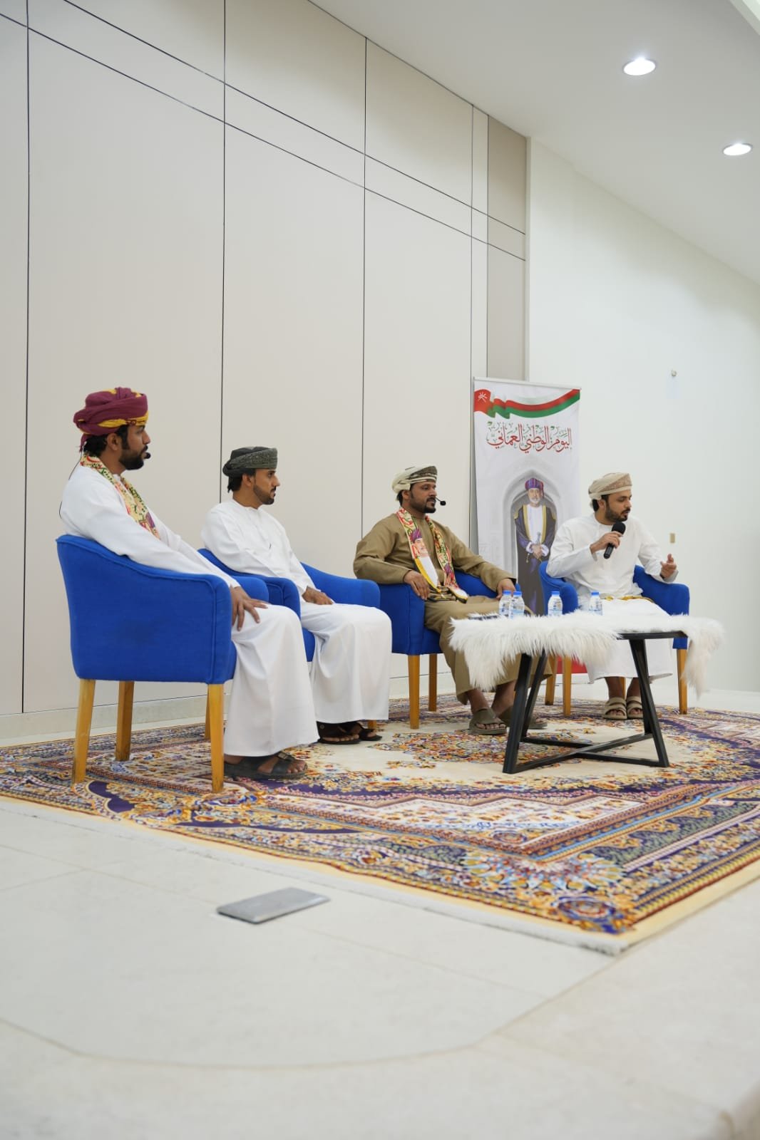 وتضمّنت الأمسية فقرات إنشادية وطنية بصوتي المنشدين عمر العميري وزكريا الصوافي من جامعة التقنية والعلوم التطبيقية بنزوى، اللذين أضفيا على الفعالية أجواءً من البهجة والفخر، قبل أن يصدح الشاعر نبهان الشعيلي بقصيدته «عُمان.. المجد التليد»، التي لاقت إعجاب الحضور لما حملته من صدق العاطفة وجمال المعنى.