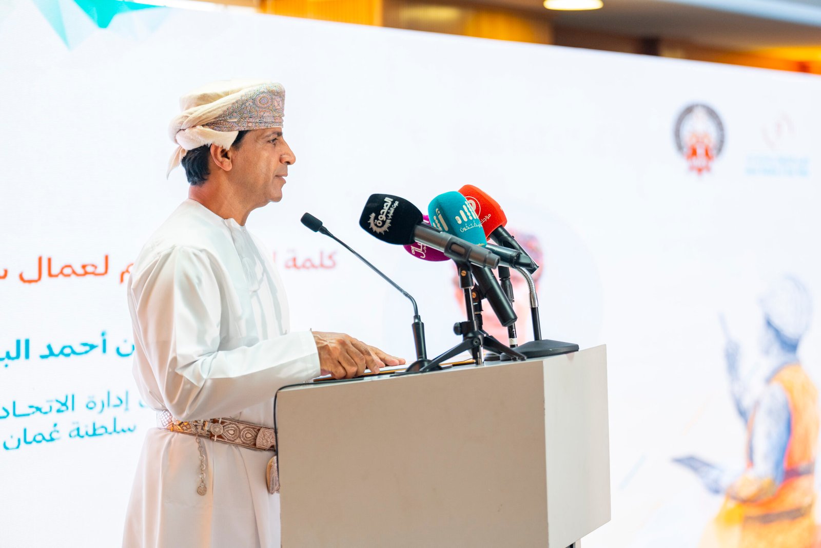 وقال: إننا نؤمن بأن أمامنا اليوم مسؤولياتٍ وطنيةً جسيمة، تفرض علينا جميعًا – نقاباتٍ ومؤسساتٍ وأفرادًا – مضاعفةَ العملِ والجهدِ لتحقيقِ تطلعاتِ عمالِ عُمان، فتحسينُ الحدِ الأدنى للأجور بما يتناسب مع متطلباتِ المعيشة، وتعزيزُ فرصِ العملِ المستدامِ للشباب، وتوسيعُ مِظلةِ الحمايةِ الاجتماعيةِ لضمانِ الكرامةِ والأمانِ لجميعِ العاملين، وتنظيمُ العملِ المنزلي والمؤقت، جميعُها غاياتٌ لا نحيد عنها، وسنعمل بالتعاونِ مع شركائِنا نحو تحقيقِها، وَفق أسسٍ قائمةٍ على الأدلةٍ والتماسكٍ في السياساتِ الاقتصاديةِ والاجتماعية.