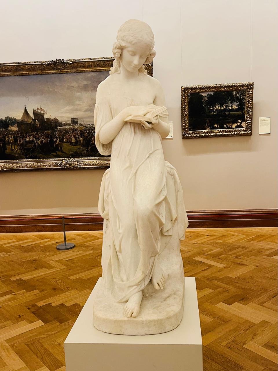وقد عرضت هذه المنحوتة في الاكاديمية الملكية في لندن عام 1837 وحصلت على شهرة واسعة في ذلك الوقت. وتعد القراءة في حياتنا واحدة من اهم الأنشطة الذهنية التي نمارسها ولها تأثيرات بالغة في حياتنا منها تحفيز العقل وتنشيط الذاكرة وكذلك تحسين المهارات اللغوية وتنمية الخيال والابداع وتطوير الذات والمهارات الشخصية كما انها تساعد ايضاً على تقليل التوتر وتحسين الصحة النفسية. وخلاصة القول بما ان القراءة لها تأثيراتها العميقة والكبيرة في حياة البشر فإن الفنان والنحات باتريك مكدويل لخصها في هذا التمثال الجميل الذي يبين أن القراءة تساهم بشكل كبير في بناء مجتمعات مثقفة.