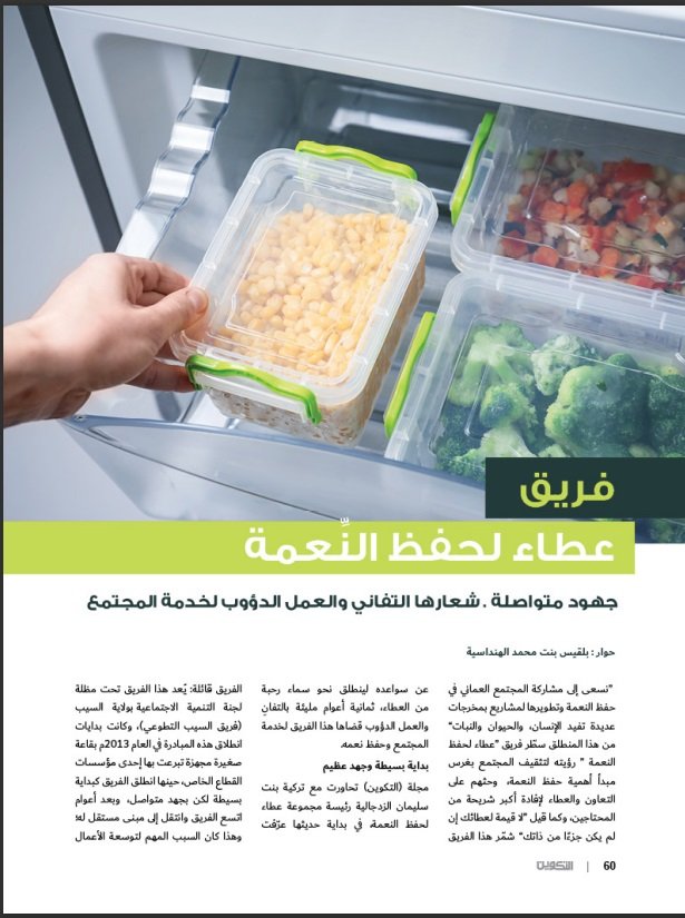 “نسعى إلى مشاركة المجتمع العماني في حفظ النعمة وتطويرها لمشاريع بمخرجات عديدة تفيد الإنسان، والحيوان والنبات“ من هذا المنطلق سطر فريق ” عطاء لحفظ النعمة ” رؤيته لتثقيف المجتمع بغرس مبدأ أهمية حفظ النعمة، وحثهم على التعاون والعطاء لإفادة أكبر شريحة من المحتاجين، وكما قيل ” لا قيمة لعطائك إن لم يكن جزءا من ذاتك ” شمر هذا الفريق ….