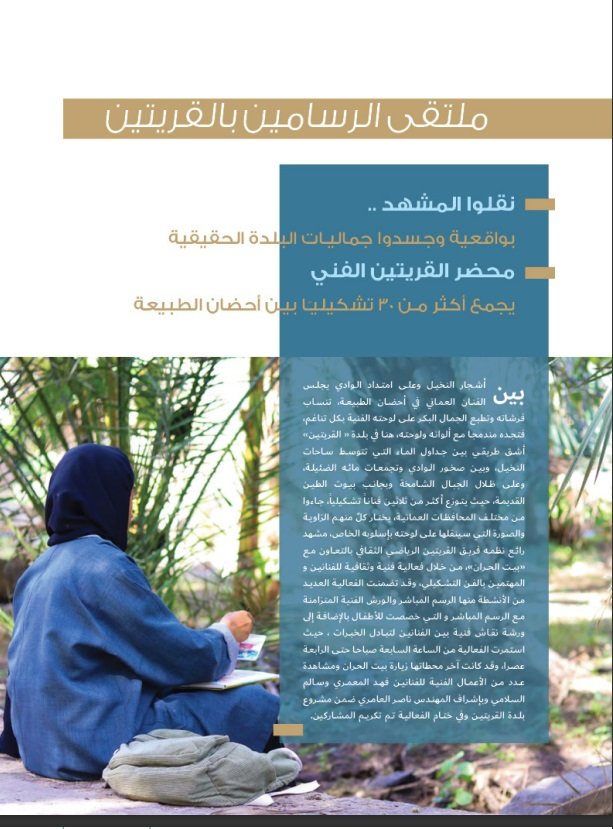 بین أشجار النخيل وعلى امتداد الوادي يجلس الفنان العماني في أحضان الطبيعة، تنساب فرشاته وتطبع الجمال البكر على لوحته الفنية بكل تناغم، فتجده مندمجا مع ألوان ولوحته، هنا في بلدة «القريتين» أشق طريقي بين جداول الماء التي تتوسط ساحات النخيل، وبين صخور الوادي وتجمعات مائه الضئيلة وعلى ظلال الجبال الشامخة وبجانب بيوت الطين القديمة، حيث يتوزع أكثر من ثلاثين فناناً تشكيلياً، جاءوا من مختلف المحافظات العمانية، يختار كل منهم الزاوية والصورة التي سينقلها على لوحته بإسلوبه الخاص، مشهد رائع نظمه فريق القريتين الرياضي الثقافي بالتعاون مع «بيت الحران»، من خلال فعالية فنية وثقافية للفنانين والمهتمين بالفن التشكيلي، وقد تضمنت الفعالية العديد من الأنشطة منها الرسم المباشر والورش الفنية المتزامنة مع الرسم المباشر و التي خصصت للأطفال بالإضافة إلى ورشة نقاش فنية بين الفنانين لتبادل الخبرات، حيث استمرت الفعالية من الساعة السابعة صباحا حتى الرابعة عصرا، وقد كانت آخر محطاتها زيارة بيت الحران ومشاهدة عدد من الأعمال الفنية للفنانين فهد المعمري وسالم السلامي وبإشراف المهندس ناصر العامري ضمن مشروع بلدة القريتين وفي ختام الفعالية تم تكريم المشاركين.