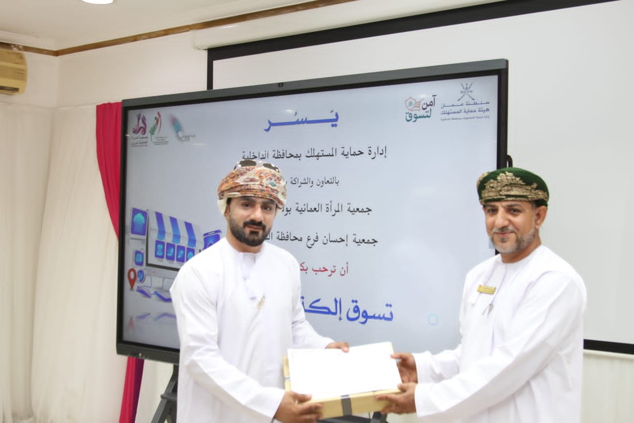 نظّمت إدارة حماية المستهلك بمحافظة الداخلية، صباح اليوم الأربعاء، ندوة توعوية بعنوان “تسوق إلكتروني آمن”، بالتعاون مع جمعية المرأة العمانية بولاية نزوى وجمعية إحسان – فرع محافظة الداخلية، وذلك في إطار الجهود المبذولة لنشر ثقافة التسوق الواعي وتعزيز حماية المستهلك في ظل التحولات الرقمية المتسارعة.
