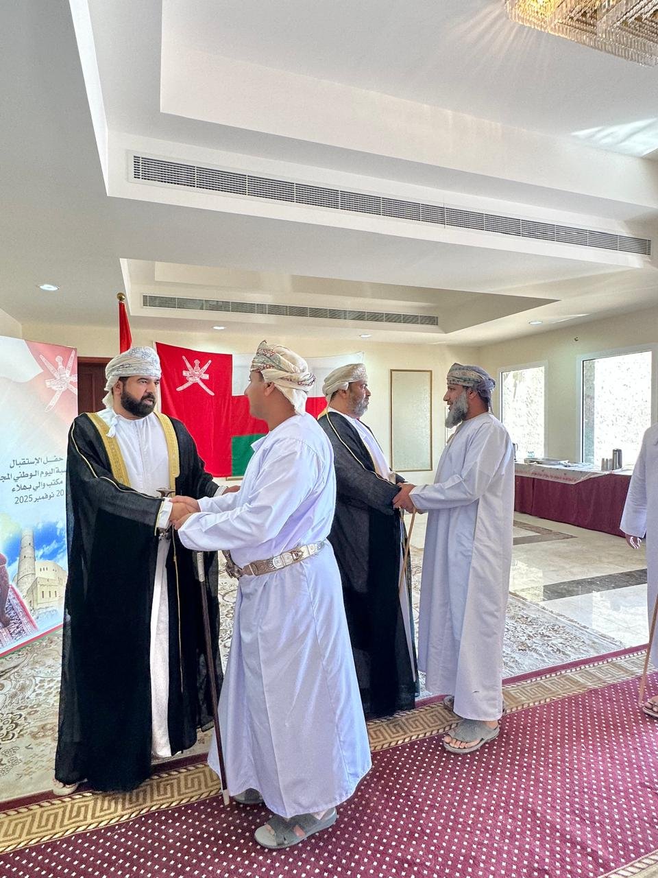 وقد استهلت الاحتفالية الوطنية باستقبال سعادة الشيخ الوالي ونائبه للمدعوين، وتبادل سعادته مع الحضور التهاني والتبريكات بهذه المناسبة الوطنية العزيزة، سائلًا المولى عز وجل أن يديم موفور الصحة والعافية على حضرة صاحب الجلالة السلطان هيثم بن طارق المعظم ـ حفظه الله ورعاه ـ وأن يمدّ في عمره أعوامًا مديدة وهو يمضي بعمان في مسيرة نهضتها المتجددة نحو مزيد من التقدم والرخاء.
