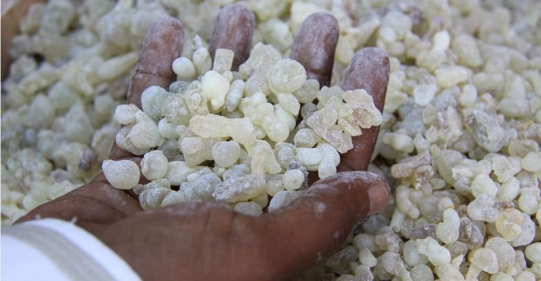 ويتدفق راتنج حليبي من جذع الشجرة ويتضخم ويتم كشطه من نفس الموضع بالشجرة بعد أسبوع، وفي المرة الثالثة “تنزف” الشجرة الأوليبانوم الثمين، الذي يعرف باسم اللبان فاتح اللون، ويتم التمييز هنا بوضوح بين أربعة مستويات للجودة حسب اللون، بدءا من اللون البني الداكن مرورا بلون العنبر والأبيض المصفر وصولا إلى اللون الأخضر الشفاف تقريبا. وكلما كان الراتنج فاتح اللون، كان أنقى وكان البخور أكثر قيمة.