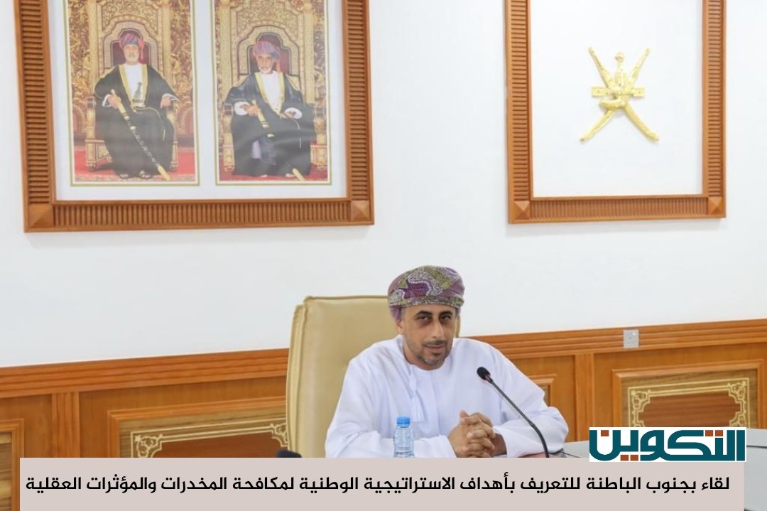 نفذت اللجنة الوطنية لمكافحة المخدرات والمؤثرات العقلية لقاء للتعريف بأهداف الاستراتيجية الوطنية لمكافحة المخدرات والمؤثرات وذلك بمكتب محافظ جنوب الباطنة برئاسة سعادة المهندس مسعود بن سعيد الهاشمي محافظ جنوب الباطنة وبحضور أصحاب السعادة ولاة ولايات المحافظة وعدد من مدراء العموم ومدراء الجهات الحكومية والعسكرية.