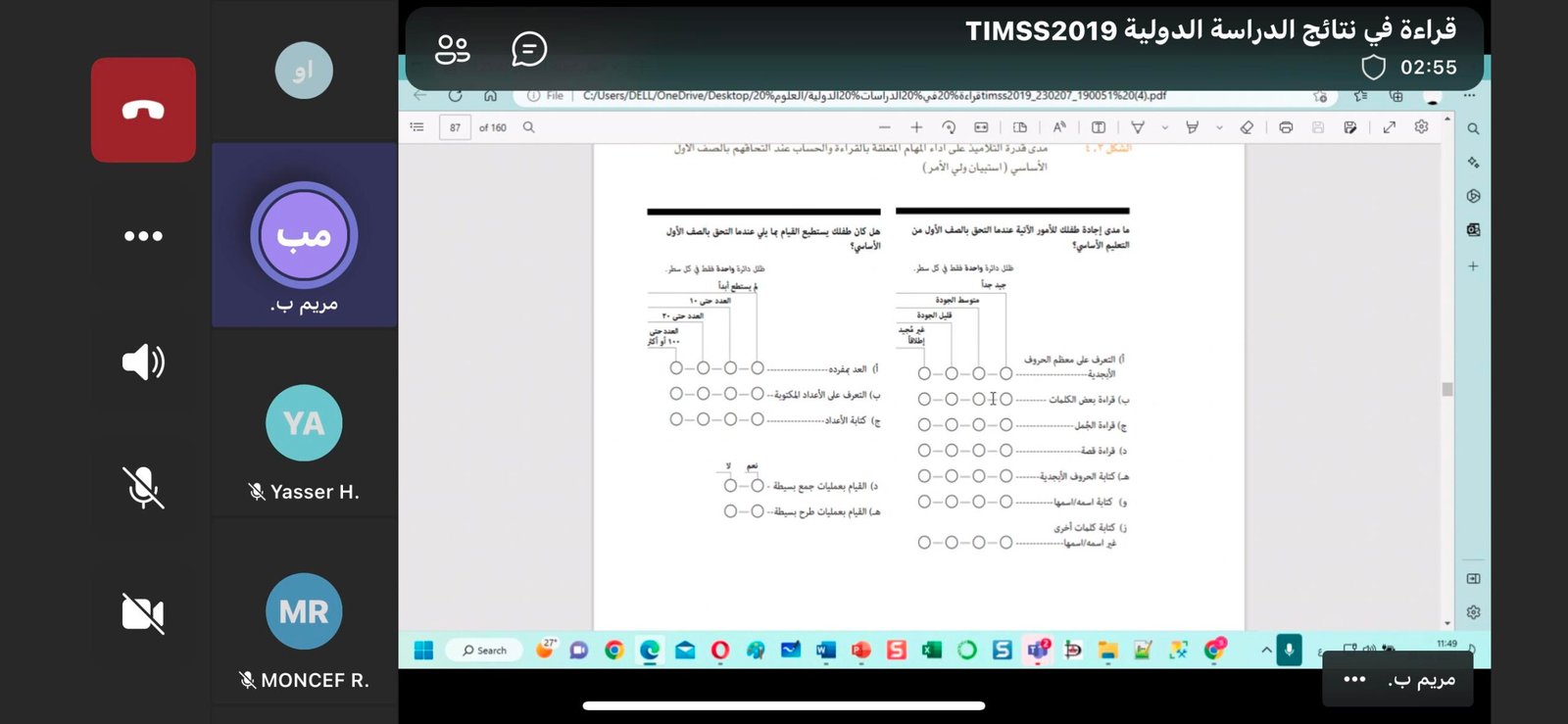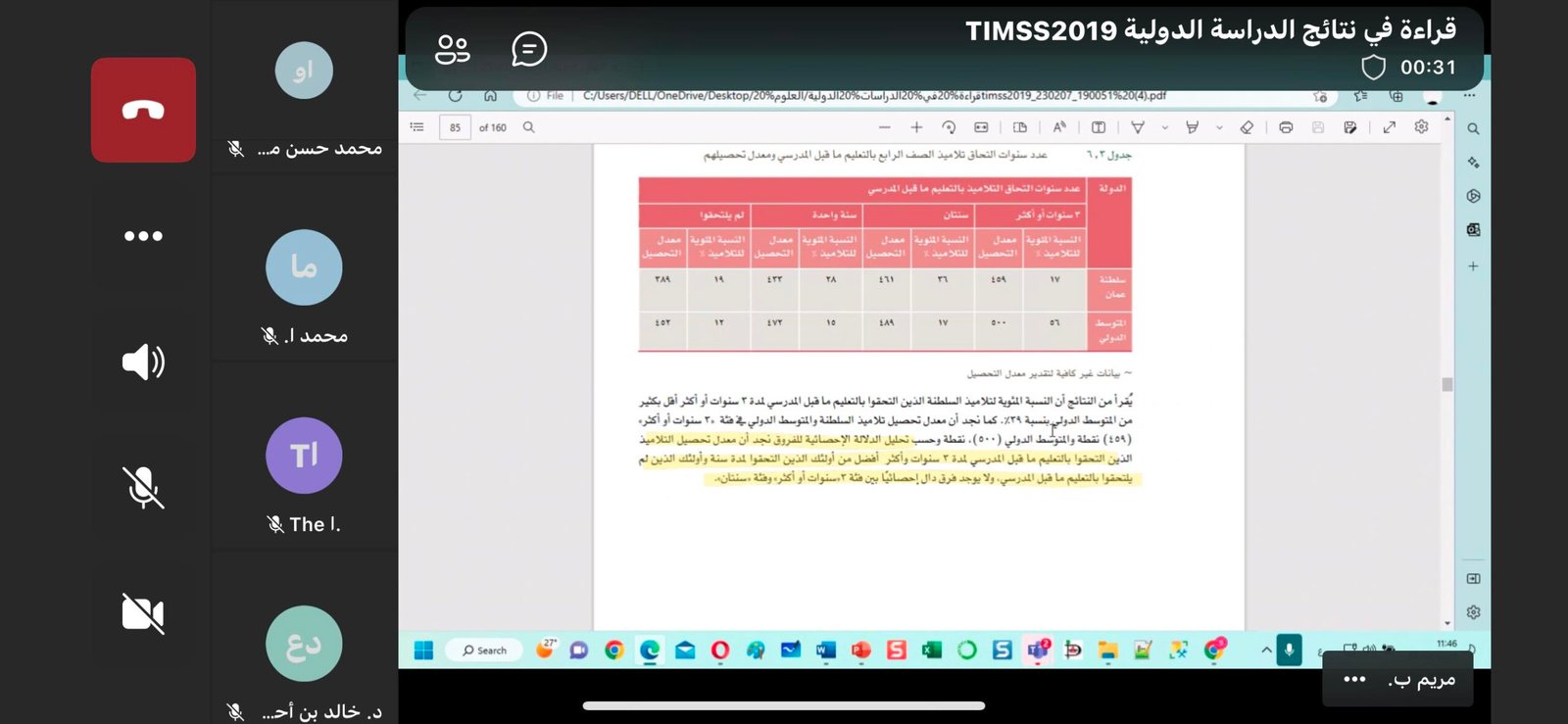 تضمن اللقاء عرضا مفصلا حول التقرير الوطني لنتائج الدراسة الدولية TIMSS 2019 نفذته مريم باعوين رئيسة قسم الدراسات والبيانات الإحصائية شمل مناقشة مستويات التحصيل في اختبار الدراسة وأثر العوامل التي تتبعها الدراسة على تلك النتائج وفقا لما ورد في التقرير الوطني.