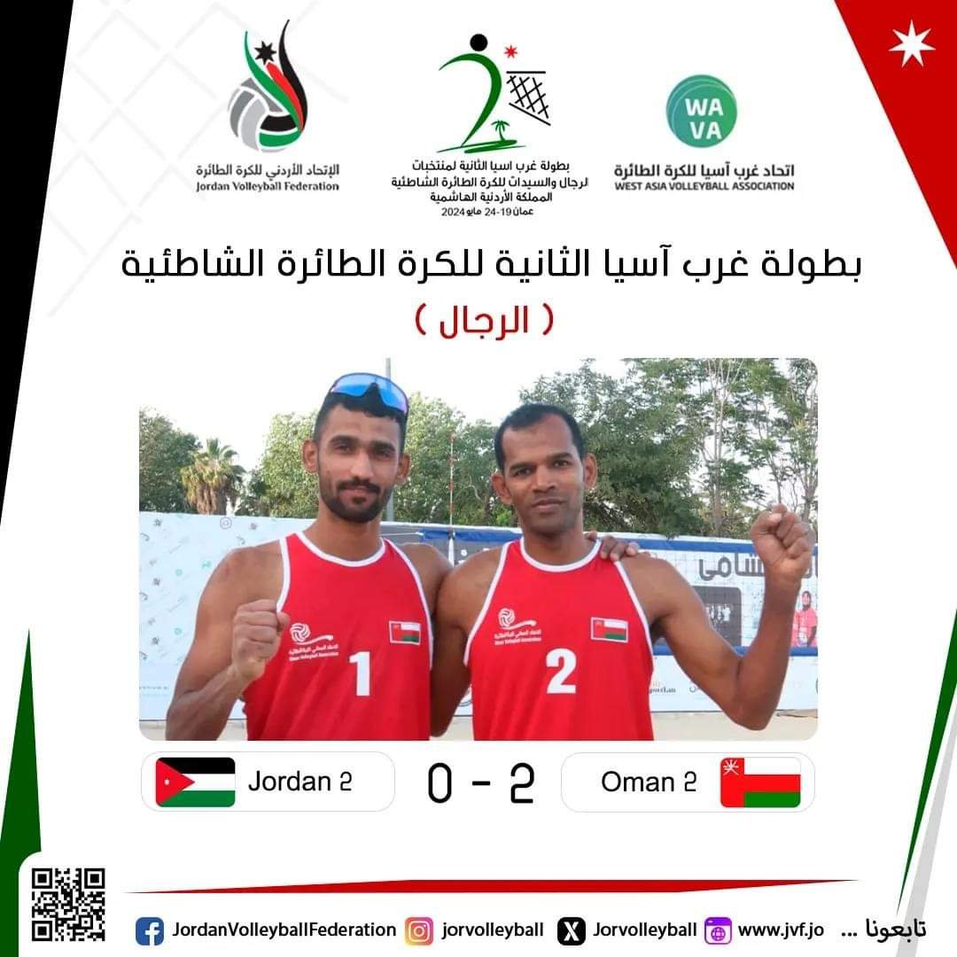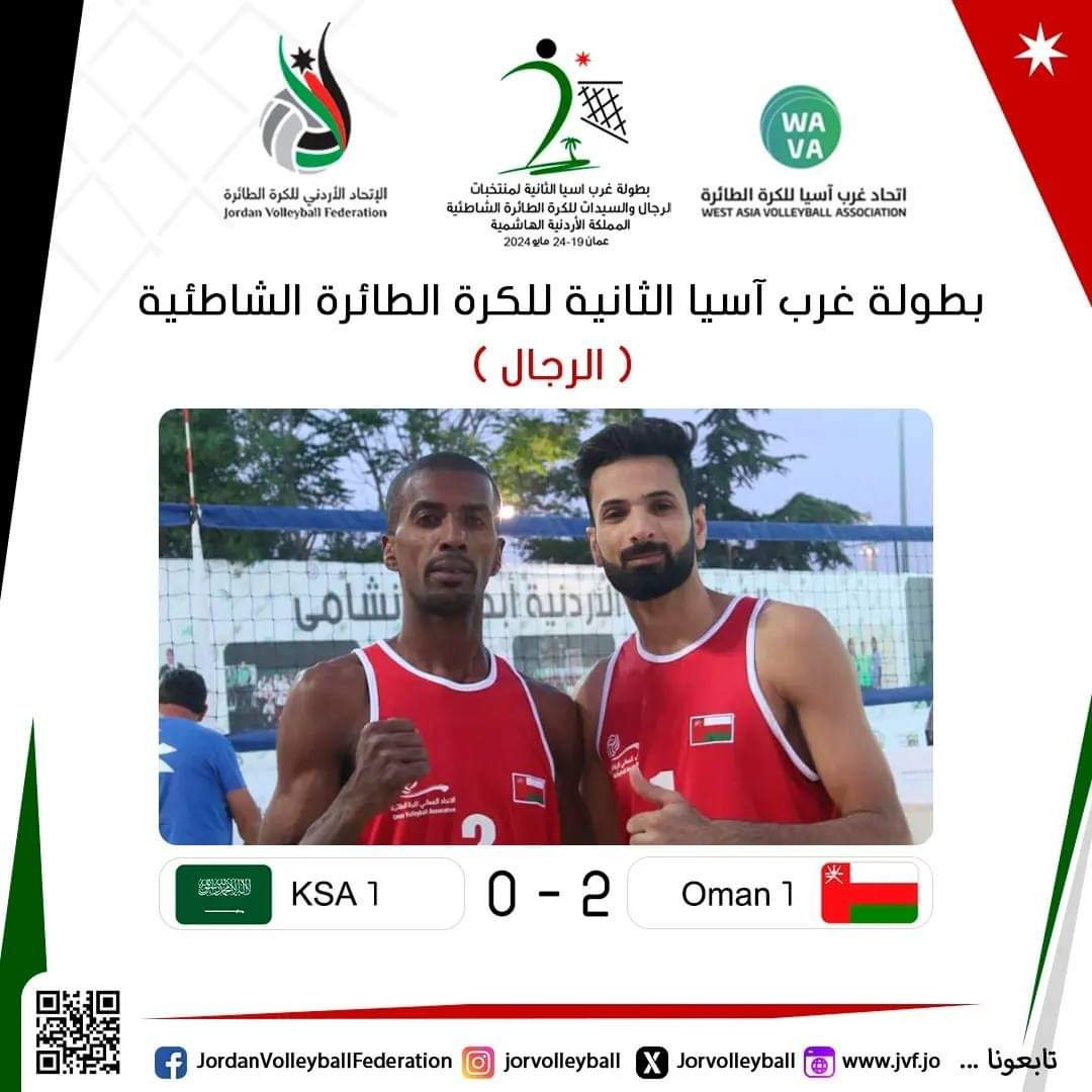 افتتحت مساء اليوم الأحد بالمملكة الأردنية الهاشمية بطولة غرب آسيا الثانية لمنتخبات الرجال والسيدات للكرة الطائرة الشاطئية، استهل من خلالها منتخبنا الوطني للرجال للكرة الطائرة الشاطئية ١ و ٢ من الفوز في مباريات اليوم الأول من دوري المجموعات،