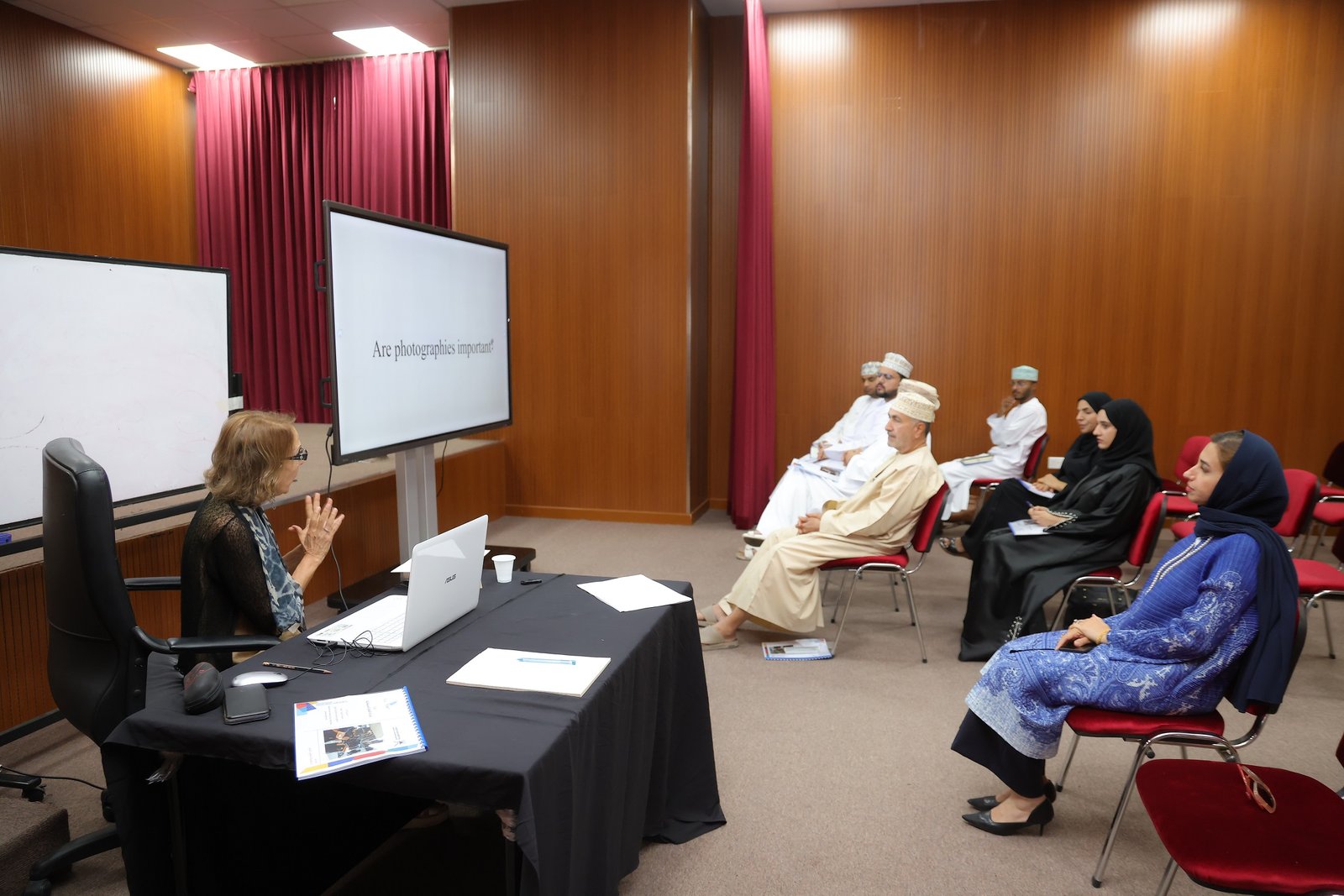 وأوضحت مدربة الورشة الدكتورة منيرة حسين حجيج أكاديمية وباحثة في الفنون واستاذ مساعد في جامعة السلطان قابوس قائلة: هناك العديد من المحاور التي تطرقنا لها وسيتم التطرق لها خلال فترة الورشة كيف نقرأ فيلما حيث انه يعد صياغة إبداعية برؤية فنية مختلفة تعيد صياغته من جديد عبر خيال فني، ومحور الثقافة البصرية وهي قدرة الفرد على بناء المعلومات بصريا تشمل مدى واسعا يمتد من الفنون الجميلة و العلامة التجارية و الافلام السينمائية، ومحور النظريات و المناهج في قراءة الأفلام الابداع الفني والبراعة التجارية والتقدم التقني للسينما تحتاج الى مشاهدة و نقد فالمشاهدون والناقدون هم من يعطون الفيلم قيمته النهائية، ومحور الفرق بين الفيلم الروائي القصير و الروائي الطويل ، والفرق بين القراءة السينمائية وقراءة النصوص، ومحور أهمية تحليل الفيلم والأدوات التي يجب التعامل معها والاقتباس والتكيف في ترجمة القصص والروايات ودراسة الأشكال والتقنيات السردية المشتركة في النص الأدبي والسينمائي.