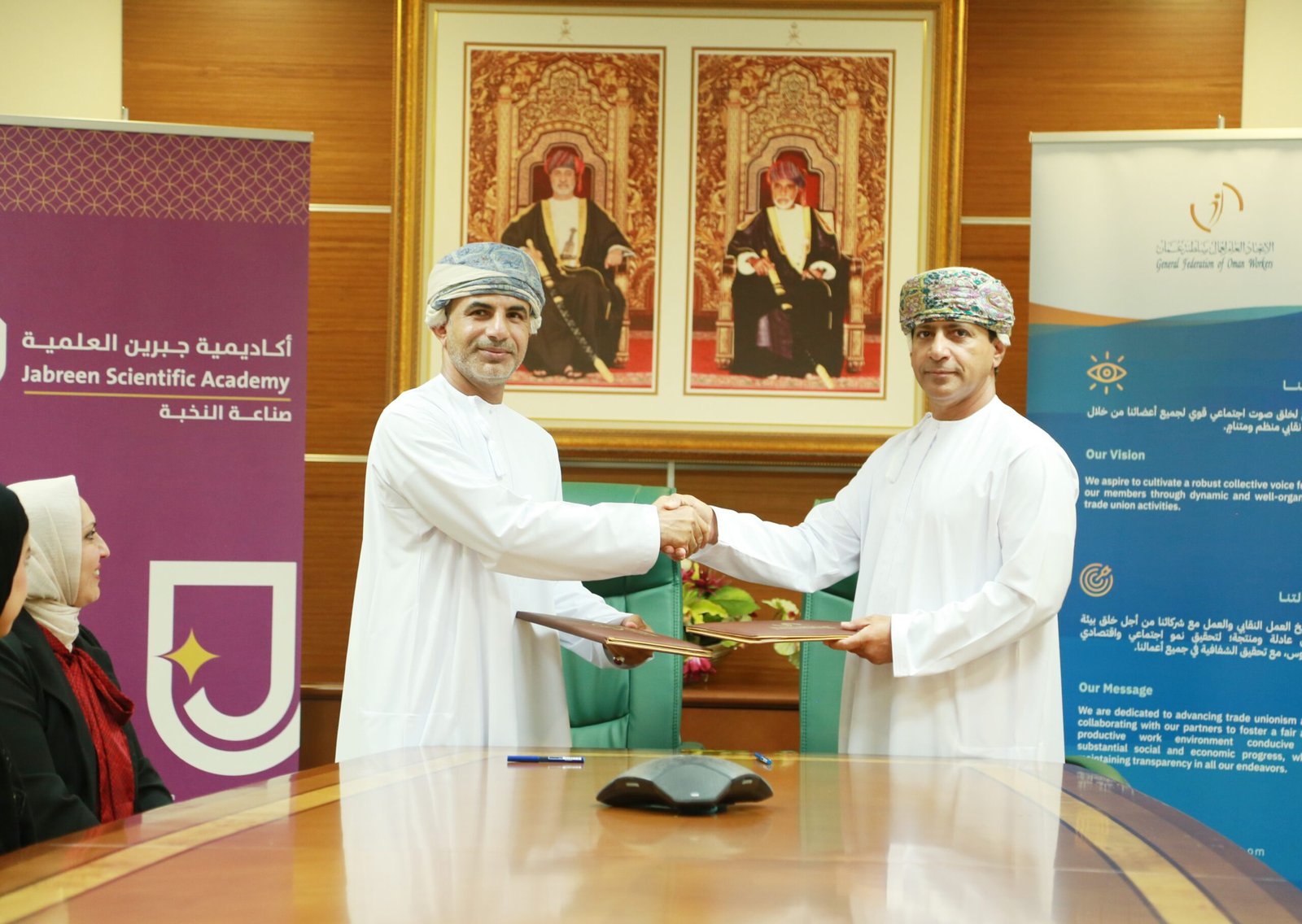 انطلاقًا من الأهداف الإستراتيجية للاتحاد العام لعمال سلطنة عُمان المتمثلة في نمو الوعي النقابي، وتقديم خدمات متميزة للأعضاء، وبناء شبكة من شركاء العمل لتقديم مزايا للأعضاء، واستنادًا إلى اختصاصات لجنة المرأة العاملة بالاتحاد العام الرامية إلى تطوير قدرات المرأة العاملة، لا سيّما ممثلات لجان المرأة العاملة في سلطنة عُمان؛ وقّع الاتحاد العام لعمال سلطنة عُمان اليوم الخميس، الموافق 22 أغسطس 2024 مذكرة تعاون مع أكاديمية جبرين العلمية، وهي مؤسسة علمية تعمل في قطاع التدريب والاستشارات والحلول المؤسسية والدراسات الإستراتيجية في عدة قطاعات تنموية.