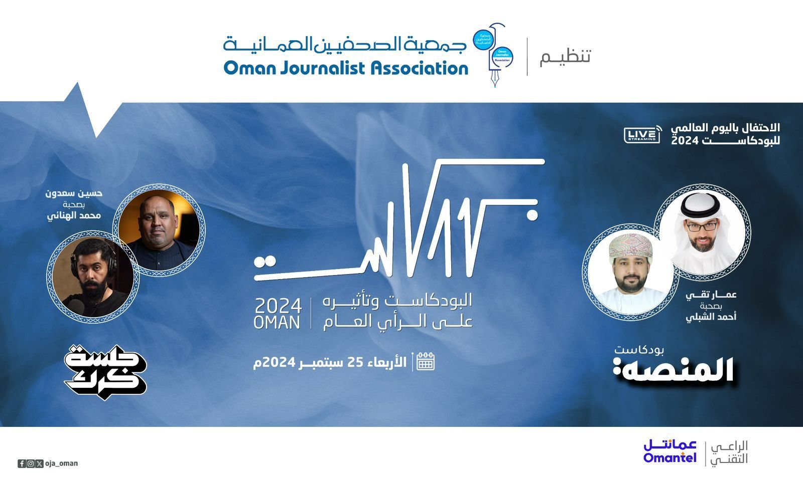 تنظم جمعية الصحفيين العُمانية ممثلة في لجنة البحوث والدراسات الإعلامية مساء الأربعاء القادم جلسة حوارية تحت عنوان ” البودكاست وتأثيره على الرأي العام ” إحتفاء باليوم العالمي للبودكاست والذي يصادف 30 من سبتمبر من كل عام ترعى فعاليات الجلسة الحوارية صاحبة السمو السيدة حجيجة بنت جيفر آل سعيد وذلك بمسرح جمعية الصحفيين العُمانية.