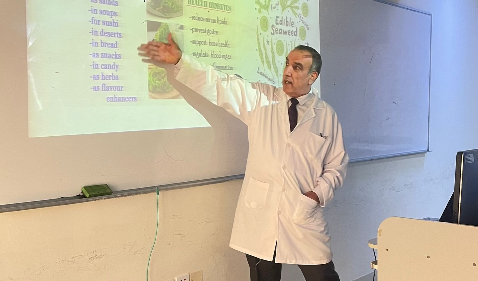 تحدث فيها الدكتور عن الطحالب وارتباطها بالإنسان من خلال استخدامها في الطب الشعبي، وكغذاء للإنسان وسماد في عدة دول منها الصين، اليابان، كوريا وغيرها، وعن عدد أنواع الطحالب ذكر أنه يوجد حوالي 8000 نوع من الطحالب الكبيرة المنتشرة في بحار العالم منها الخضراء والحمراء والسمراء، ولأهمية الطحالب فقد استُثِمر قسماً كبيراً منها تجارياً نظراً لغناها بالبروتينات والليبيدات ومضادات للجراثيم والفيروسات والطفليات والفطريات وبعض المركبات الفعالة بيولوجياً لبعض أنواع السرطانات مثل سرطان الرحم والثدي والقولون.
