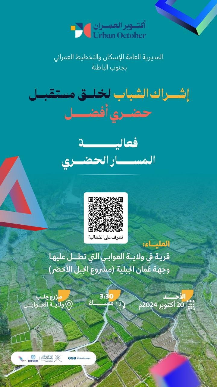 نظمت المديرية العامة للإسكان والتخطيط العمراني بمحافظة جنوب الباطنة ممثلة بدائرة الإسكان والتخطيط العمراني بالرستاق مساء اليوم الأحد فعالية المسار الحضري وذلك بمزرع جلب بوادي بني خروص بولاية العوابي تحت رعاية سعادة الشيخ الدكتور حمود بن علي المرشودي والي العوابي وبحضور سعادة طارق بن محمد الخروصي عضو مجلس الشورى ممثل ولاية العوابي والدكتور جمال بن عبدالله المحروقي مدير دائرة الإسكان والتخطيط العمراني بالرستاق وعدد من الشيوخ والمدعوين.