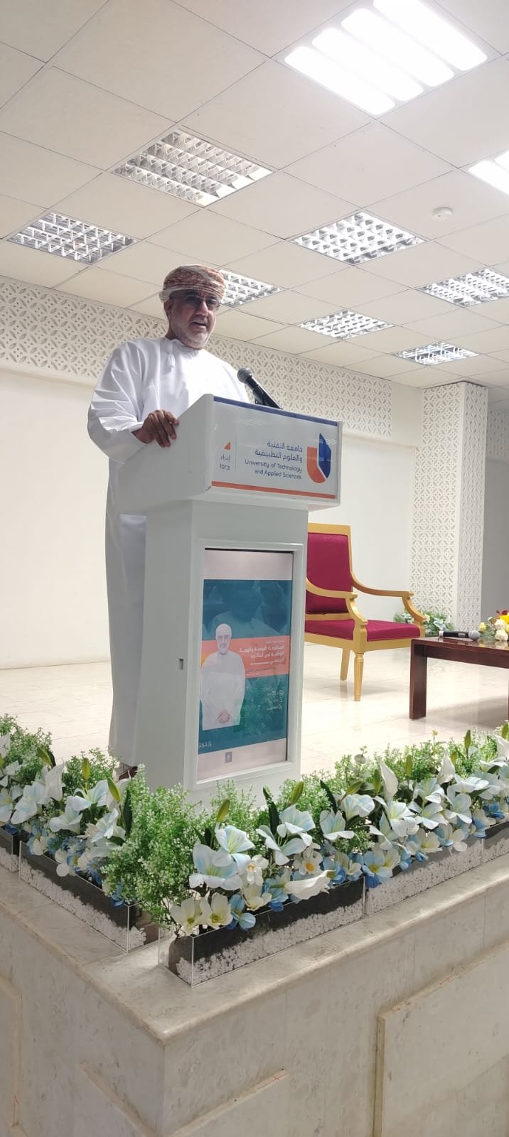 واشار الدكتور الرحبي الى اهمية التقيد بالثوابت المستمدة من الدين الاسلامي في كل النواحي الخاصة بالطالب حيث ان الطالب سفير لهذه المؤسسة التعليمة حيث يجب عليه التفاعل مع المجتمع بشكل ايجابي . كما وجه الى حسن استخدام المرافق التي يوفرها فرع الجامعة … و تحدث الدكتور عبدالله بن خلفان العزري مساعد نائب الرئيس للشئون الاكاديمية حيث قال : ارحب بكم في هذا الصرح العلمي و انتم سيكون لكم يوم اخر و هو تتويجكم على منصة التخرج و خلال هذا الفترة عليكم الجهد و الاجتهاد و ان تكونوا على قدر المسولية و لا بد ان تترسخ فيكم الهوية العمانية بكل تفاصيلها من حيث اللبس و السمت العماني الاصيل و تحدث كذلك عن الجانب الاكاديمي من حيث الاستفادة من المصادر و المواضبة على التحصيل التعليمي و كذلك مشاركة الانشطة مع مجتمع الجامعة ..