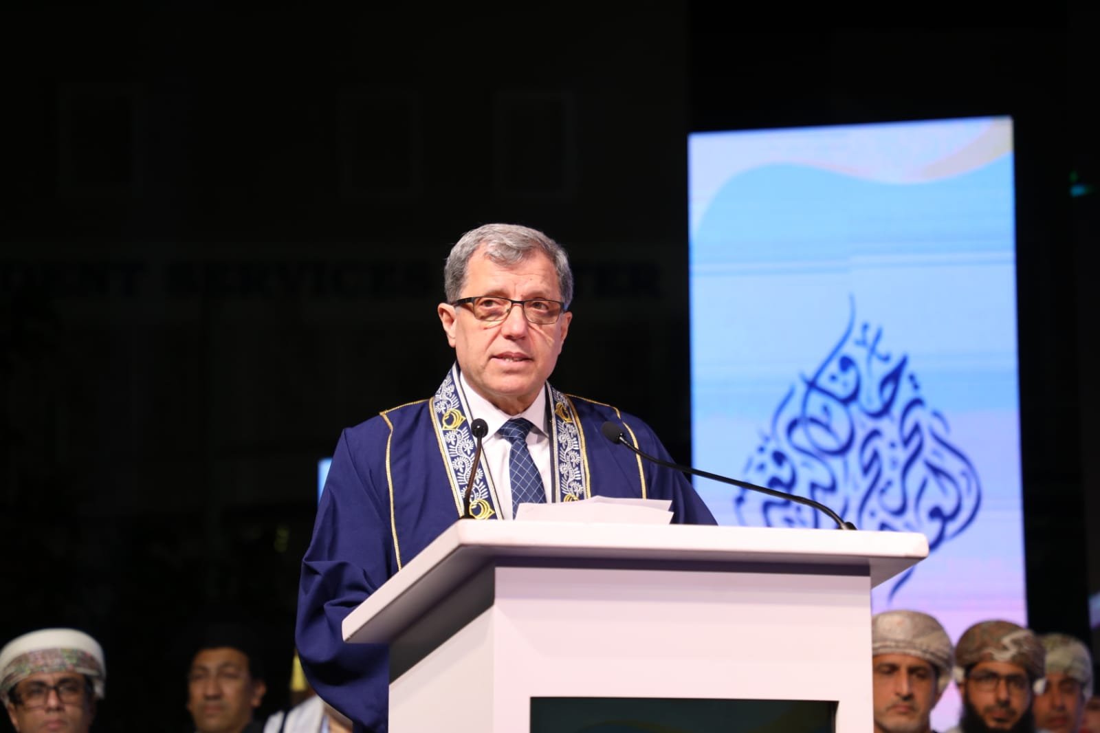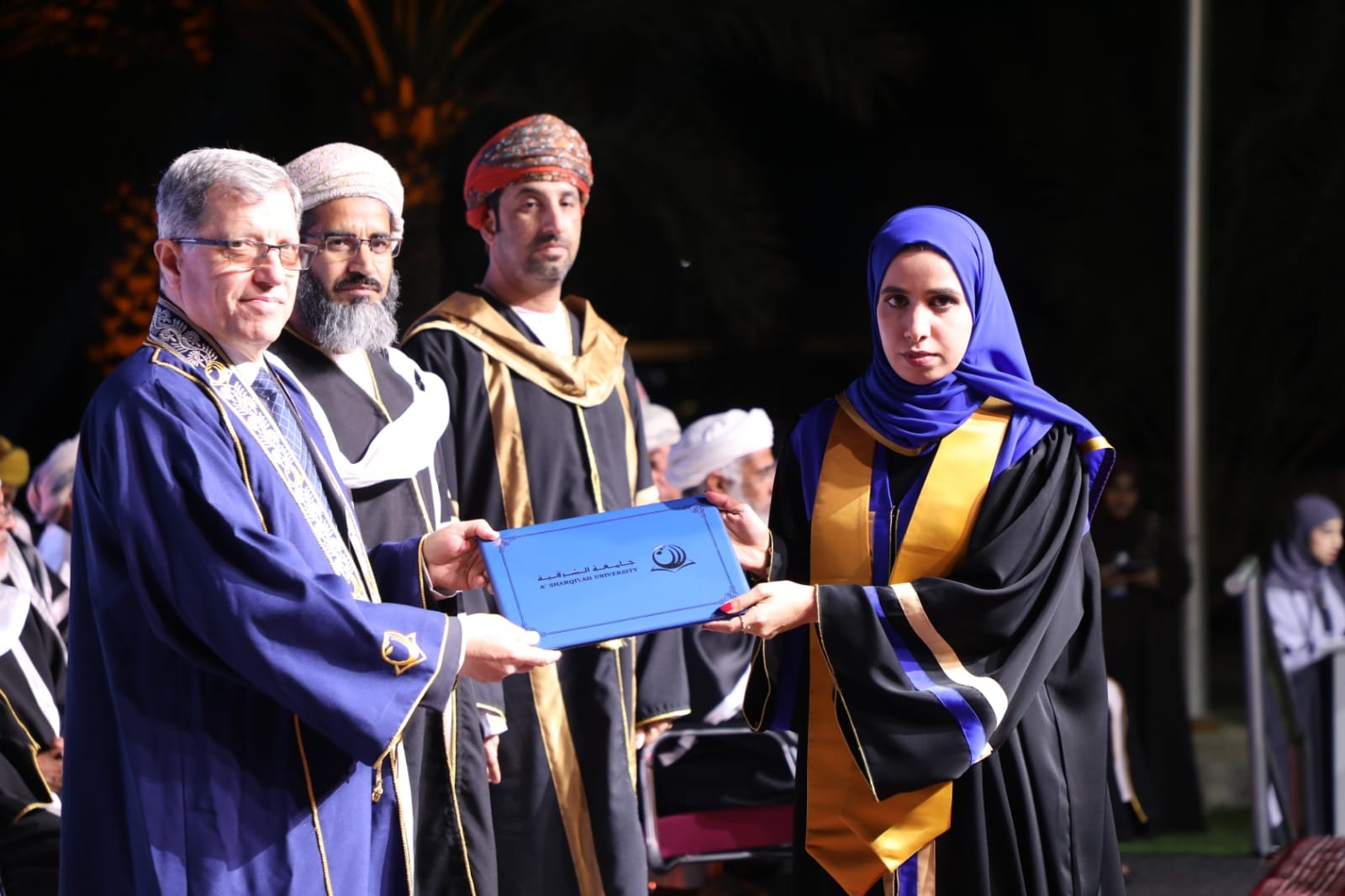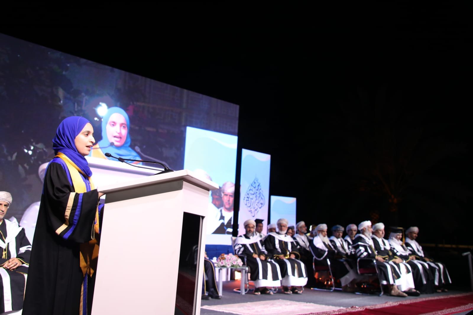 وأختتمت كلمتها بالقول : زملائي الخريجين والخريجات، لقد صنعنا هذا التخرج معا، وإن هذا اليوم ليس نهاية الطريق، بل هو البداية الفعلية لمسيرة البناء والعطاء. نحن اليوم نطوي صفحة من حياتنا كانت مليئة بالجهد والتحديات والطموحات ونستقبل مرحلة جديدة مليئة بالفرص وتحقيق الأحلام وها نحن اليوم نغادر هذا الصرح العظيم، نحمل في قلوبنا ذكرى جميلة، وفي عقولنا زاد العلم والمعرفة، وفي أرواحنا طموح يعانق عنان السماء. نعاهد الله ثم وطننا بأن نبقى أوفياء لرسالتنا، سفراء للعلم والعمل، عاملين بجد واجتهاد لرفعة هذا الوطن العظيم تحت ظل قيادته الحكيمة، داعين الله أن يحفظ عمان أرضا وقائدا وشعبا في خير وسلام وأمن وأمان على الدوام.