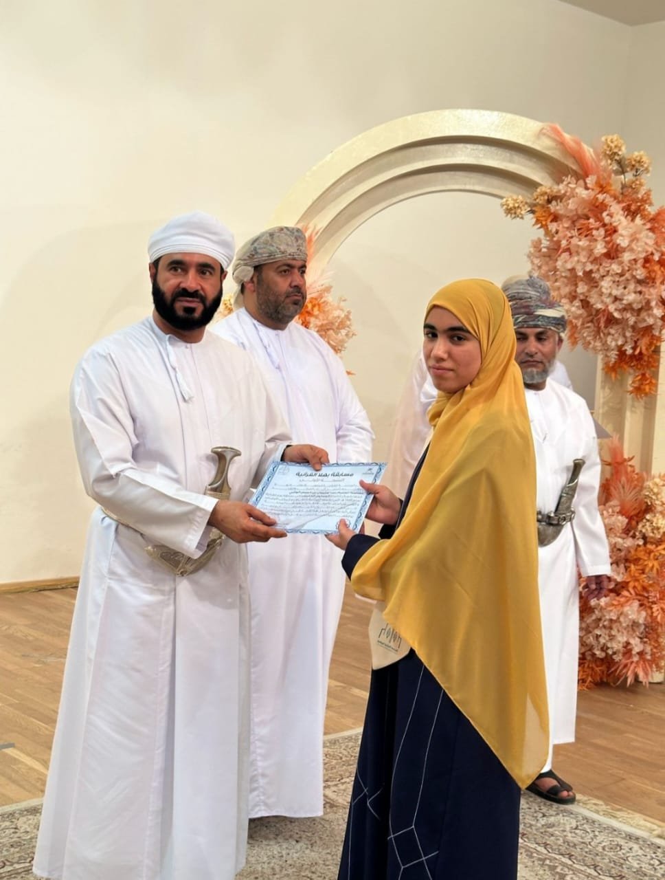 وزكرياء بن سليمان بن السبع الهنائي في المركز الثاني وأحمد بن محمد بن سالم الكندي في المركز الثالث ورقية بنت عبدالله بن سالم اليحيائية في المركز الرابع ونورة بنت أحمد بن سعيد القصابية في المركز الخامس وحمد بن علي بن سعيد العدوي في المركز السادس.