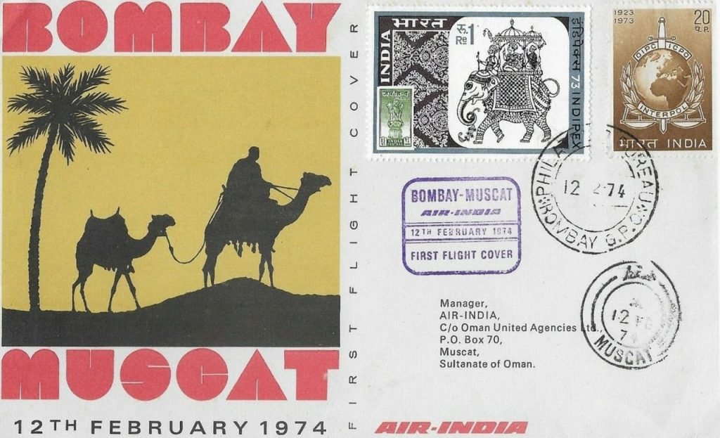 وهنا نستعرض مغلفا أرسله مدير شركة الطيران الهندي مؤثقا بتاريخ إقلاع الرحلة وهو 12 فبراير 1974م، من مكتب بريد بومباي على نفس الرحلة، وبالمقابل قام مدير الفرع بالسلطنة بعمل مغلف بنفس التاريخ وخُتِمَ من أحد مكاتب البريد العمانية. بالإضافة إلى عمل عدة مغلفات أخرى لهواة البريد الجوي، إذ أن التاريخ البريدي مقسم إلى عدة أقسام وتخصصات، وهذا قسم خاص بهواة جمع البريد الجوي أو بريد الطيران، وله هواة متخصصون بجمع وتوثيق رحلات الطيران الأولى بين الدول، وأغلب شركات الطيران تتعاون مع هواة بريد الطيران في عمل مغلفات كنوع من الدعاية لها.