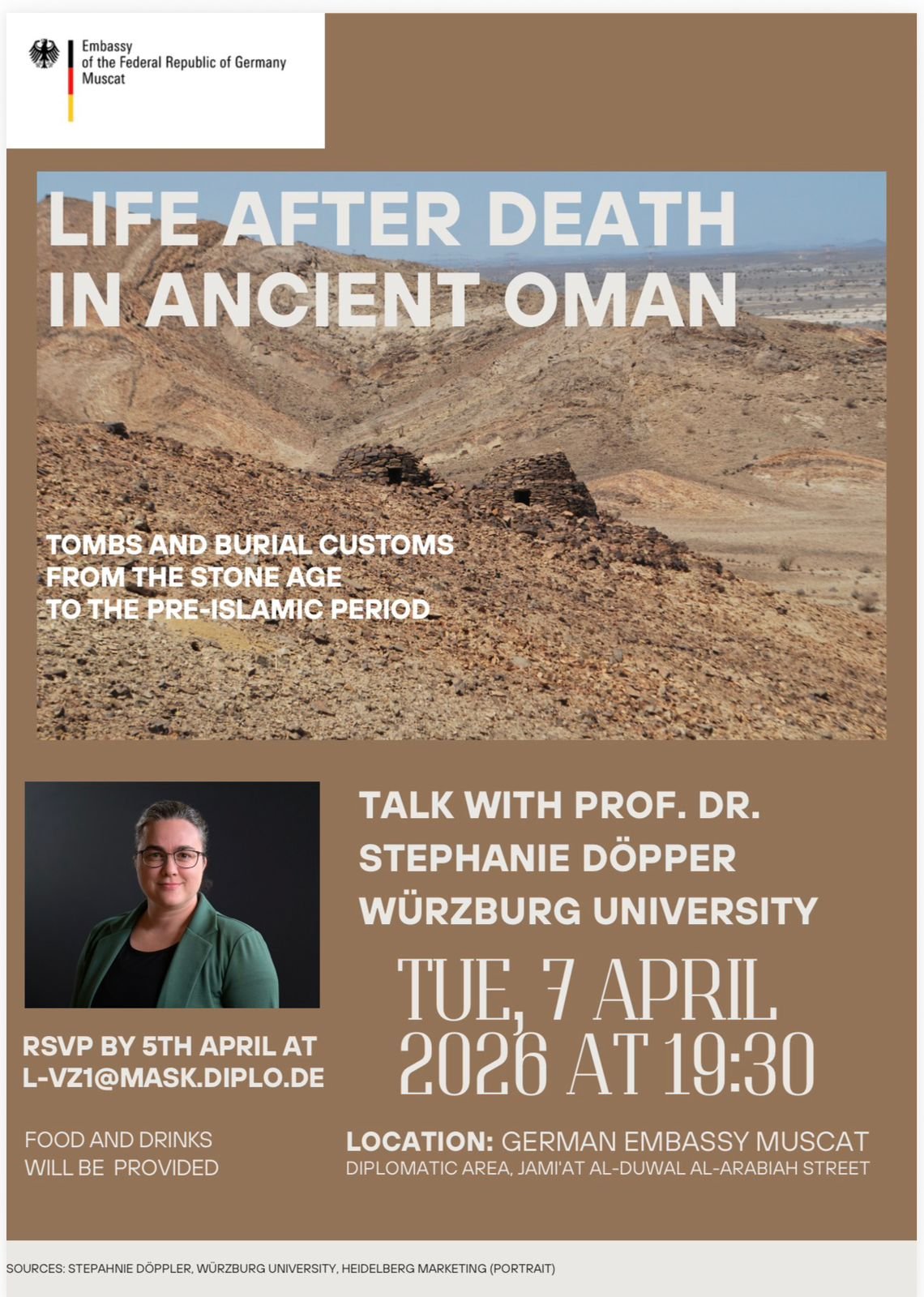 في أجواء ثقافية ثرية بالحوار والمعلومات استضافت السفارة الألمانية في مسقط اليوم محاضرة علمية مميزة تناولت موضوع الحياة بعد الموت في عُمان، بحضور نخبة من أعضاء الجمعية العمانية التاريخية وعدد من المهتمين بالشأن التاريخي والثقافي.