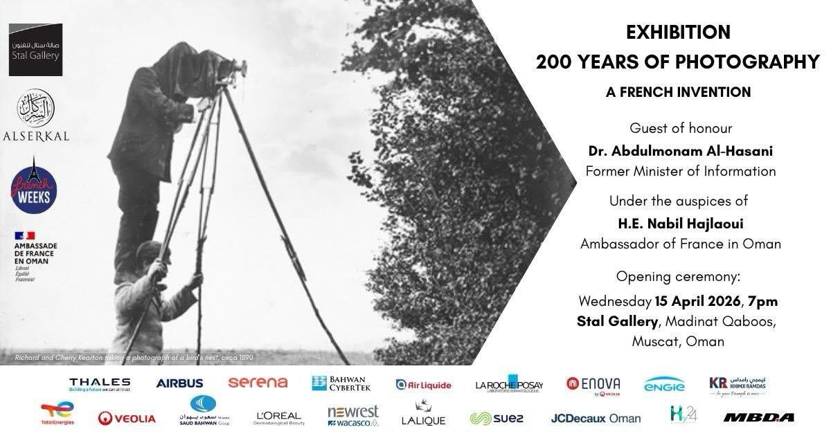 في إطار فعاليات الأسابيع الفرنسية في سلطنة عُمان تفتتح السفارة الفرنسية في مسقط يوم الأربعاء القادم معرض٢٠٠ عام من التصوير الفوتوغرافي بصالة ستال مدينة السلطان قابوس،