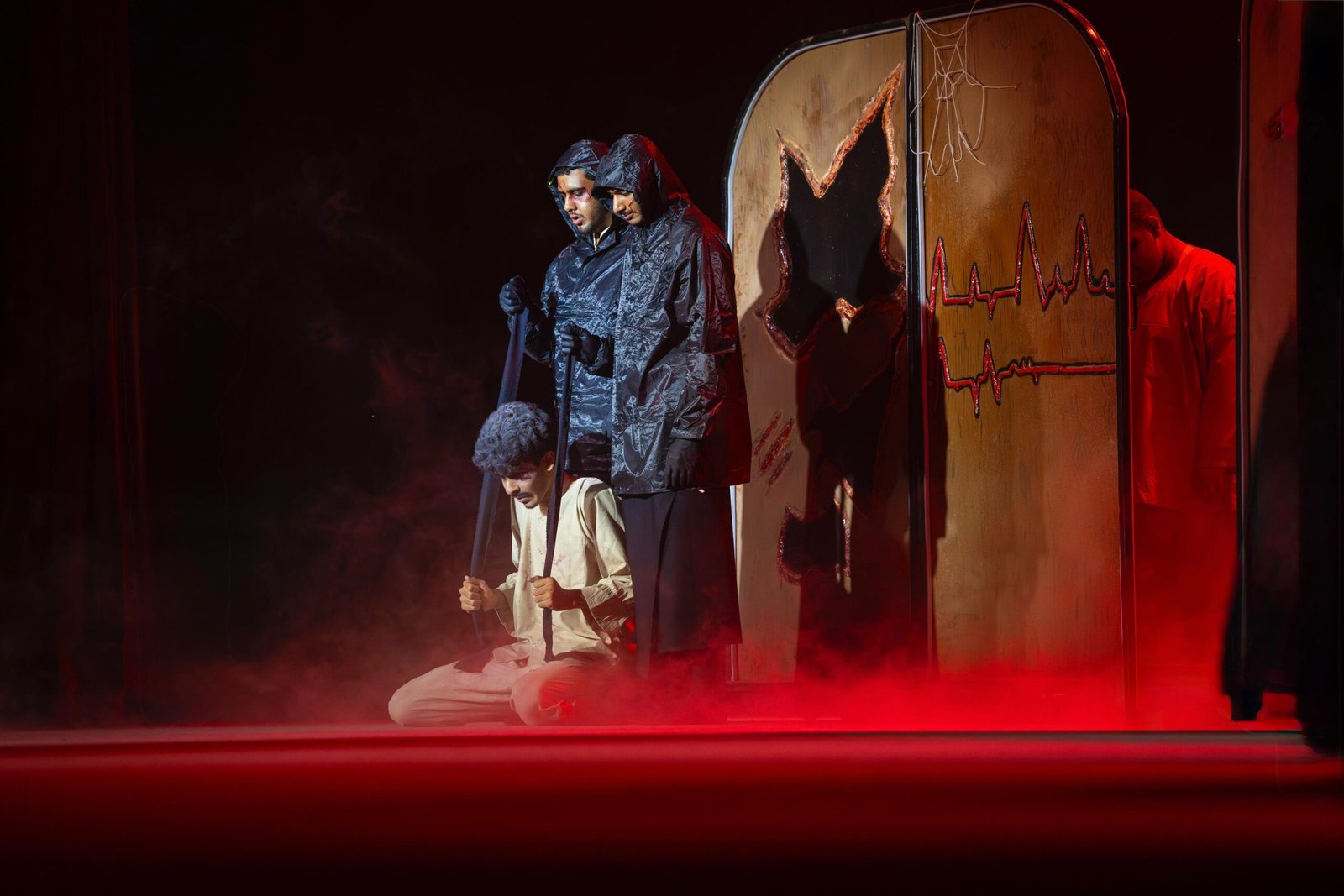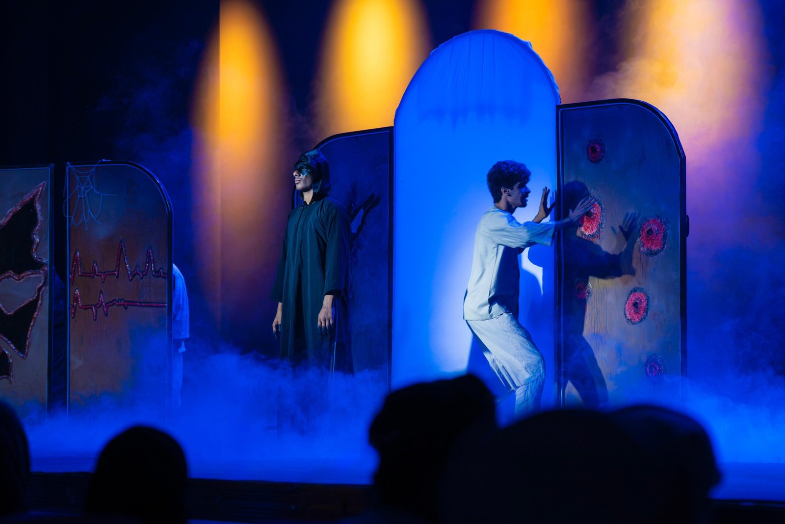 واعتمد العرض على ثنائية العتمة والنور كإطار درامي يعكس تحولات النفس الإنسانية، مسلطًا الضوء على قضايا اجتماعية، من أبرزها الإدمان، والتفكك الأسري، والاغتراب النفسي، إلى جانب تأثير القرارات الفردية في تشكيل المصير الإنساني. كما تميز بتوظيف بصري لافت قائم على رمزية الأبواب السبعة، التي جسدت مراحل الانتقال من الضياع إلى الإدراك، في معالجة مسرحية ذات بعد توعوي ورسائل إنسانية مؤثرة.