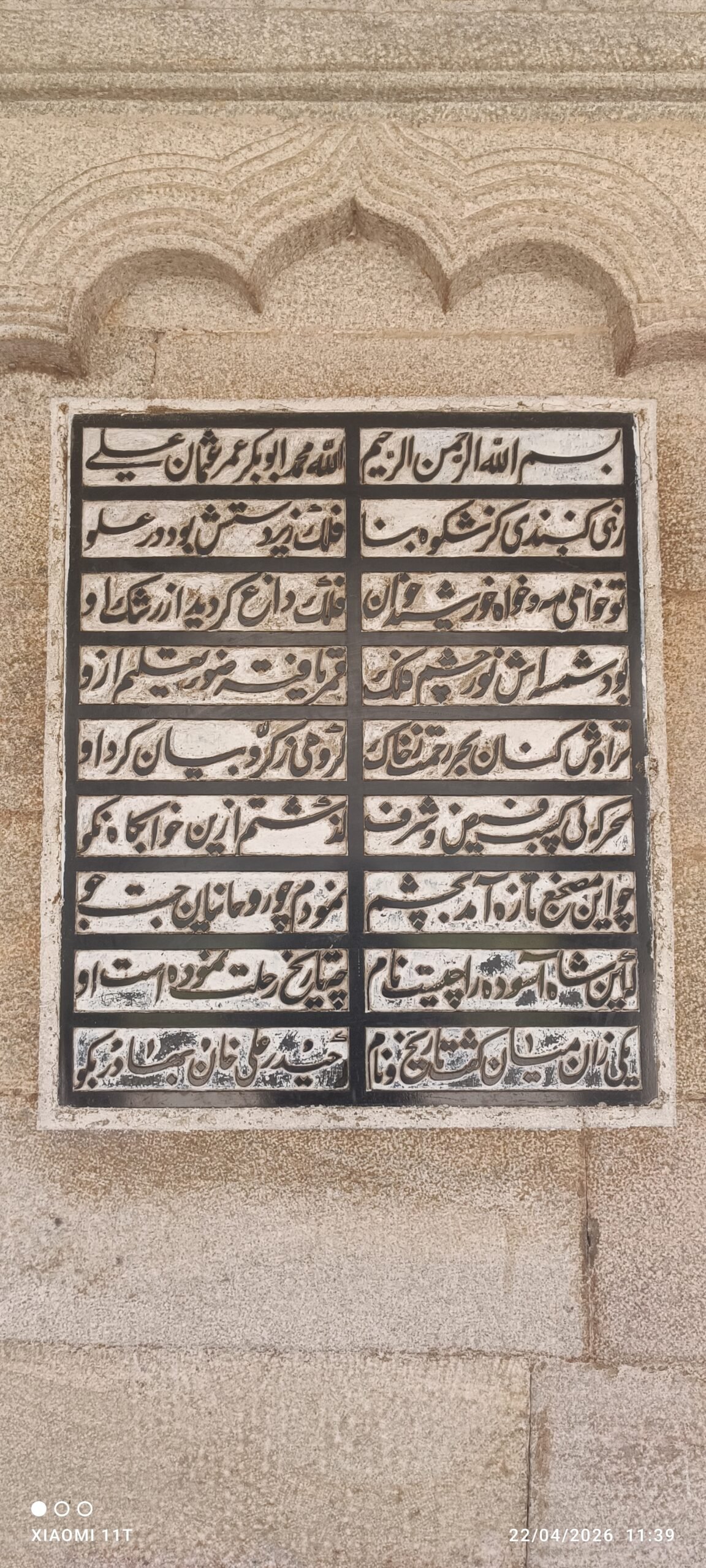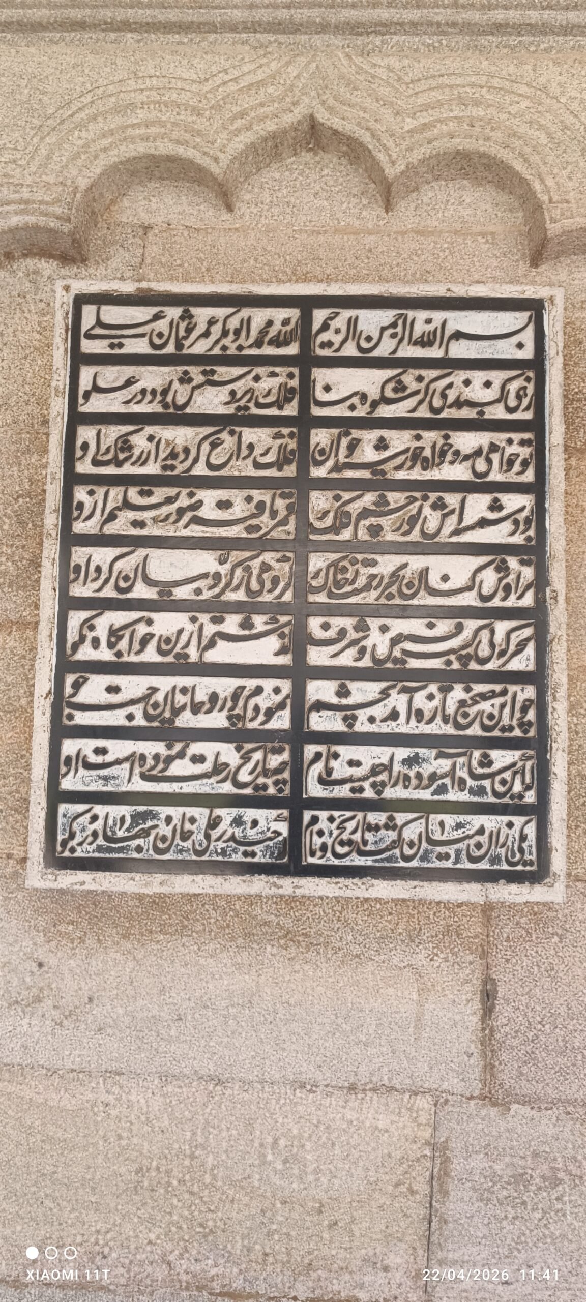 من أجمل اللقطات التي وثقتها عدستي هي صورة اللوحة الرخامية المحفورة بالخط الفني البديع. تعد هذه اللوحة وثيقة أدبية وتاريخية تفيض بمشاعر الإجلال، حيث يتداخل فيها الخط العربي والفارسي بأسلوب يبرز الروابط الثقافية العميقة التي جمعت حضارات الشرق. تعبر هذه النقوش عن مناقب الحكام الراحلين، وتضفي على المكان صبغة من الخلود الفني.