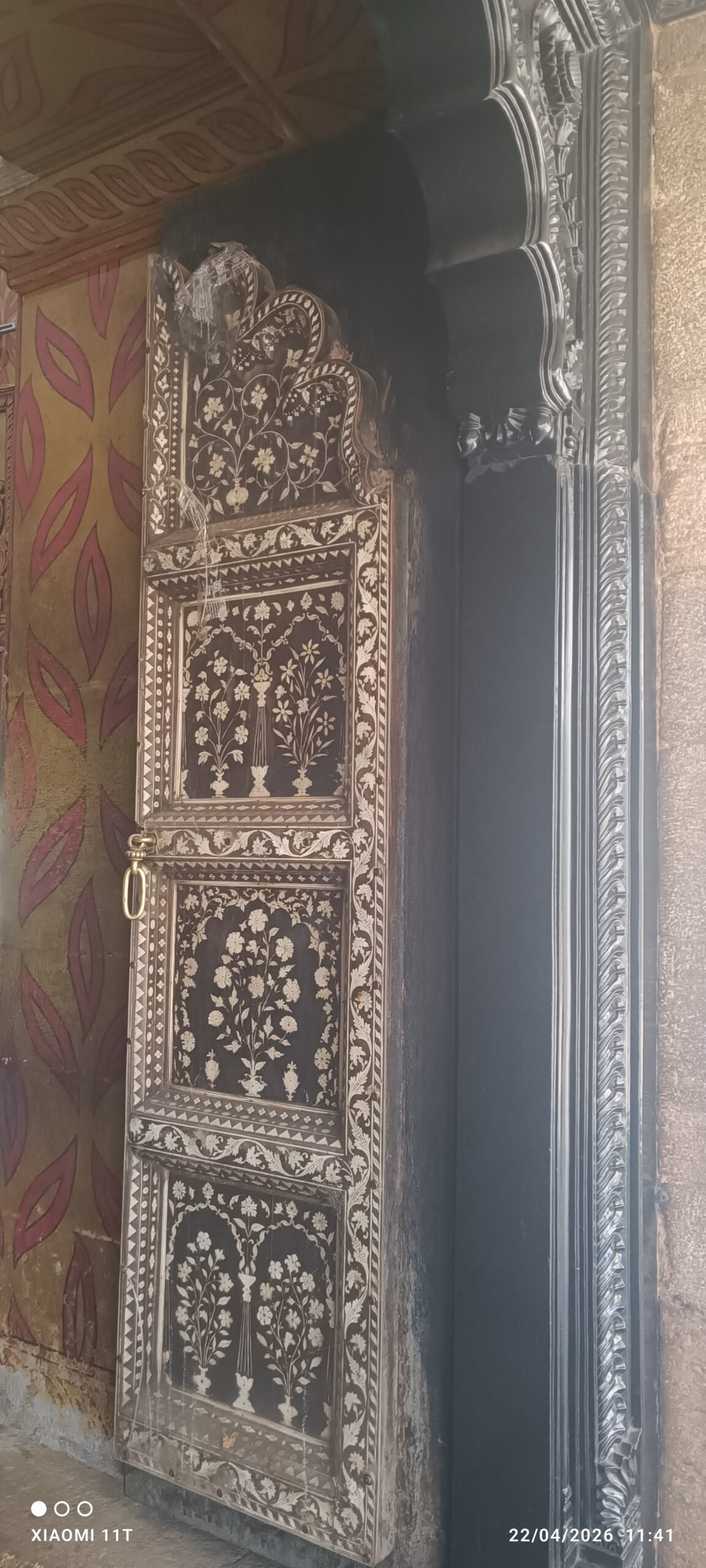عند اقترابي من مبنى الضريح الذي يعود لعام 1784م، تأملتُ تفاصيله التي تجمع بين القوة والجمال. يرتفع المبنى فوق منصة عالية، ويحيط به رواق فسيح ترتكز أسقفه على أعمدة مهيبة من حجر البازلت الأسود.