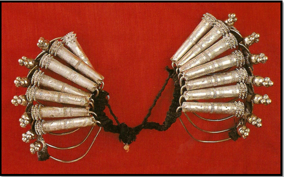 وهذه الأقراط عبارة عن شرائح فضية متراصة بجانب بعضها البعض، ايقاعاته تكاد تتكرر على مسمع مني كلما شاهدت هذه الأقراط وفضولي يدفعني لتناول عصي الإكسليفون للطرق على اسطواناتها، فاي نغمات سأسمع؟ يبلغ مقاسها 3.75 سم. ثبتت باستخدام خيوط الصوف وأسلاك الفضة وتدلت منها كور فضية وسلاسل تمسك شرائح على هيئة شوكة. الصور (4،5).
