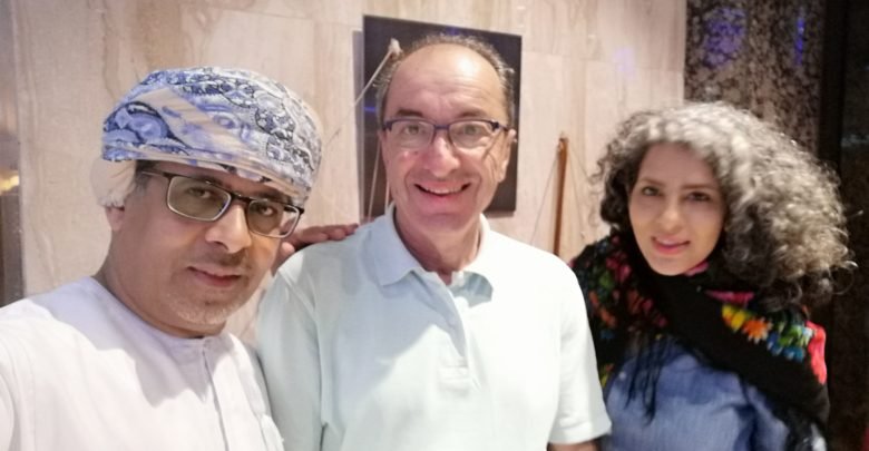 علي بارسا يتوسط مدير التحرير حسن المطروشي والشاعرة الإيرانية مريم حيدري