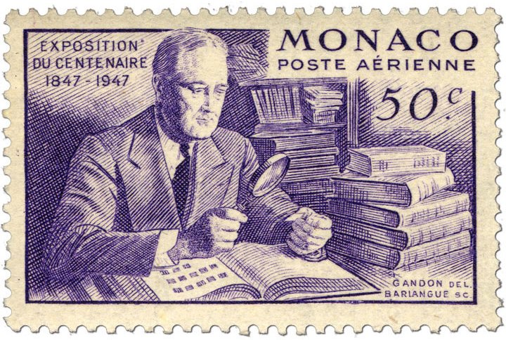 ومن المفارقات أنه وقع خطأ في الطابع الذي أصدرته له إمارة موناكو، وكما نرى من خلال صورة الطابع وهو يمسك المكبر بيده الشمال، نلاحظ أنه رسمت 6 أصابع ليده!